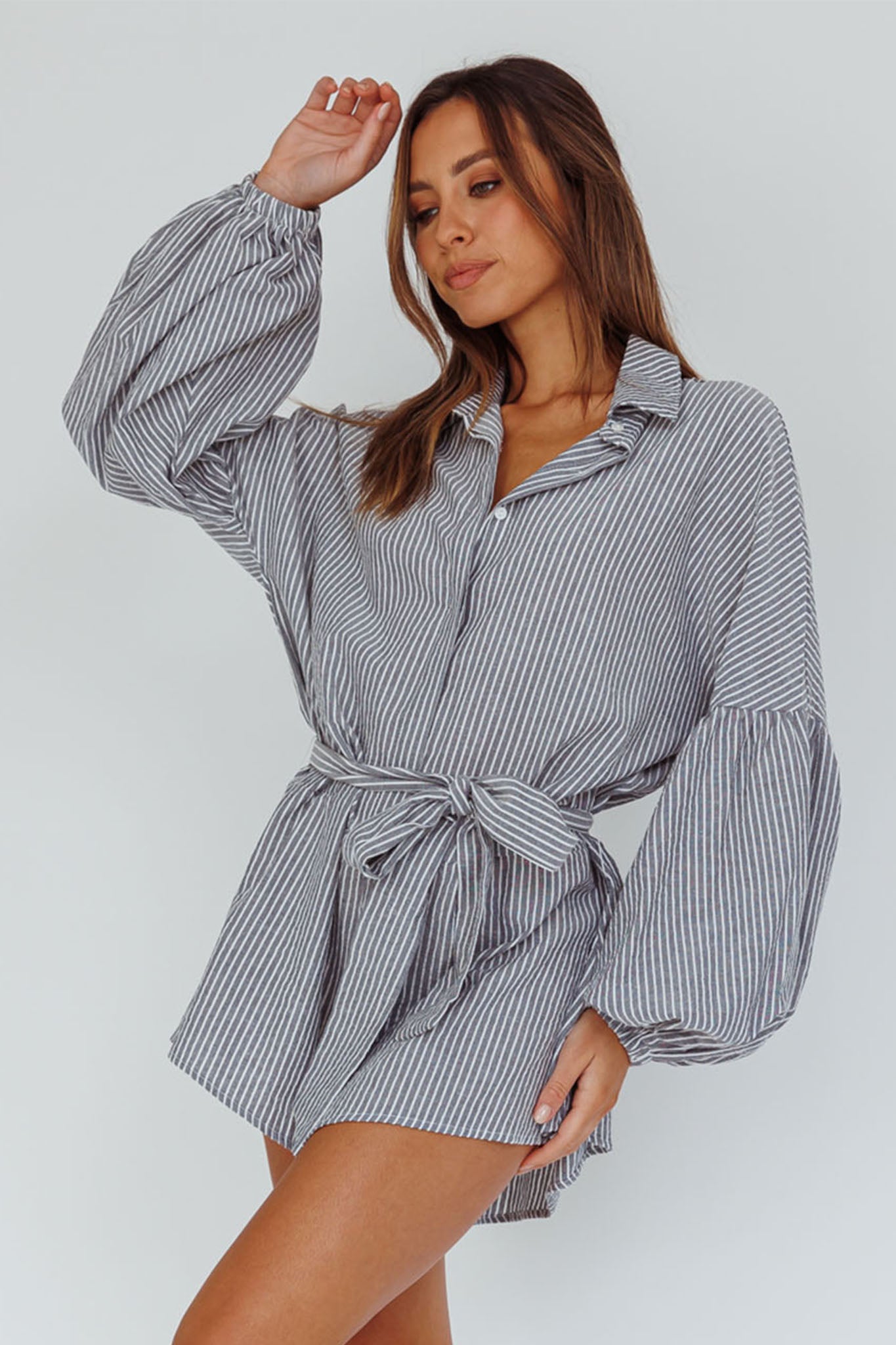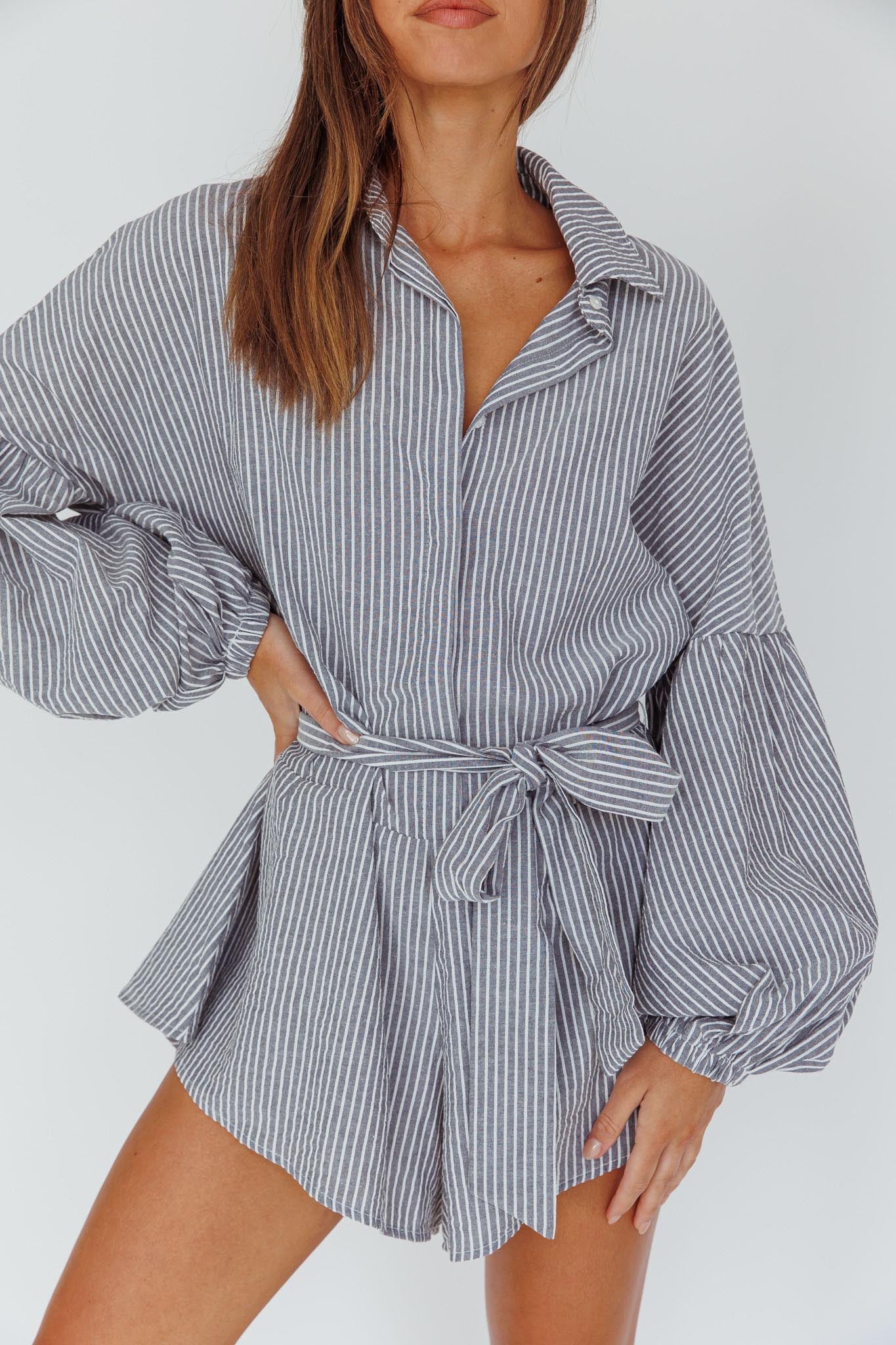 Breeze through your day in style in our chic Daytona Beach romper. Featuring a long sleeve, shirt style and removable waist tie, it's perfect for weekend coffee dates with your girls teamed with a straw tote and slides.