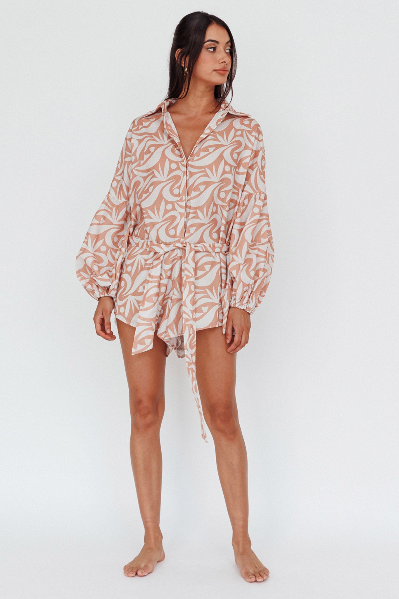 Breeze through your day in style in our chic Daytona Beach romper. Featuring a long sleeve, shirt style and removable waist tie, it's perfect for weekend coffee dates with your girls teamed with a straw tote and slides.