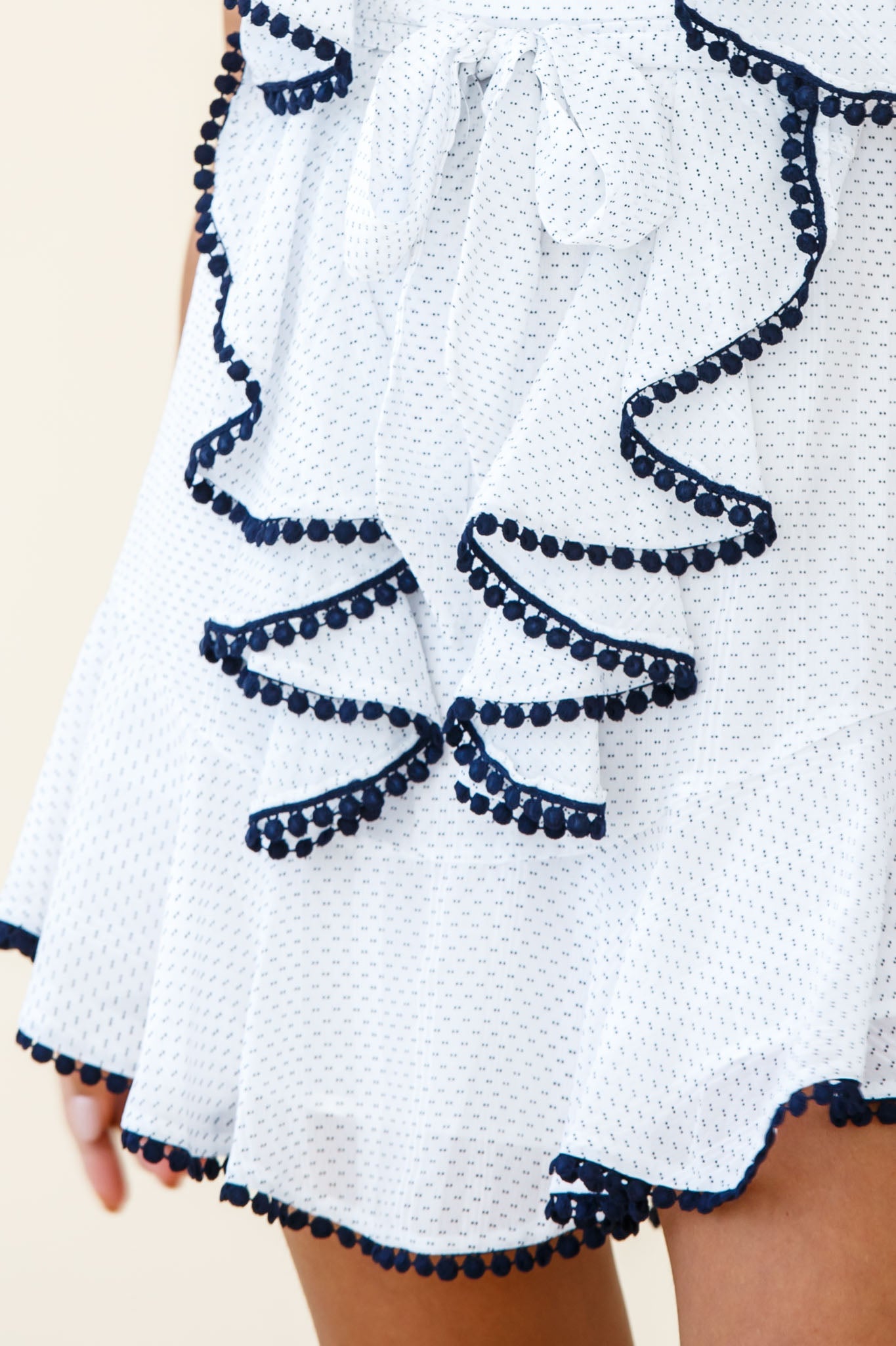 Make an entrance in our chic and unique Deandra dress. We are loving the ruffle inserts and pretty embroidery trim. Perfect for brunching with your besties or wear it to work with tan mules and a tote and show them who's boss!