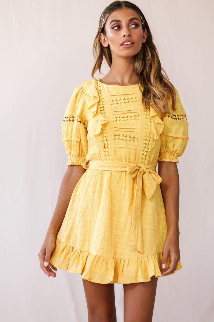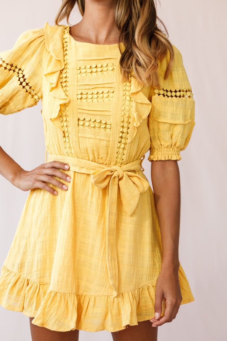 Delia Puff Sleeve Crochet Detail Dress Mustard