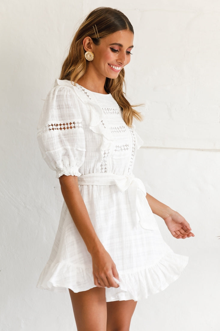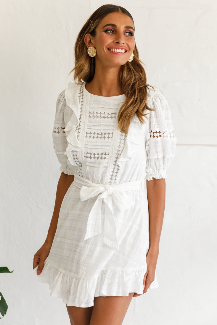 Sugar couldn't make you any sweeter in our darling Delia dress. Featuring adorable puff sleeves, crochet inserts, ruffle hem and separate waist-tie. Perfect for Sunday Brunch or mall day with the girls. Team it with espadrille wedges and a straw tote for a super cute look.
