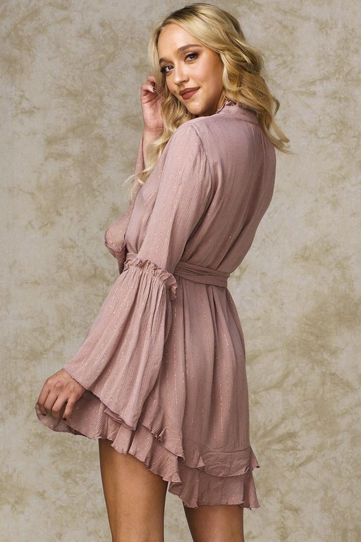 This mocha dress is so hot, yet still so cool. Cute ruffles and bell sleeves keep things girly. Best worn with gold heels.
