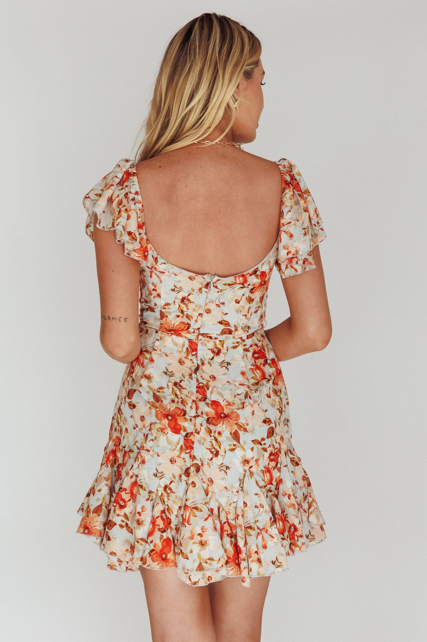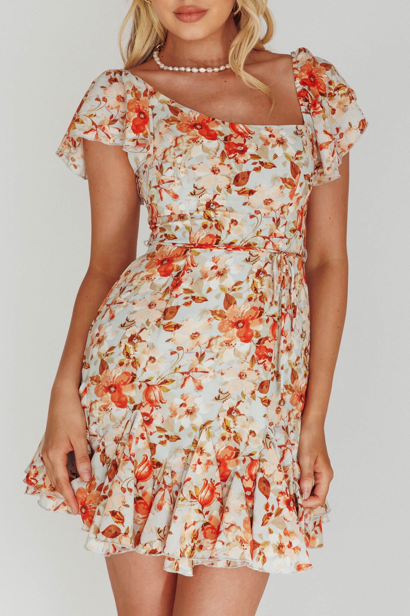 - Orange, floral mini dress