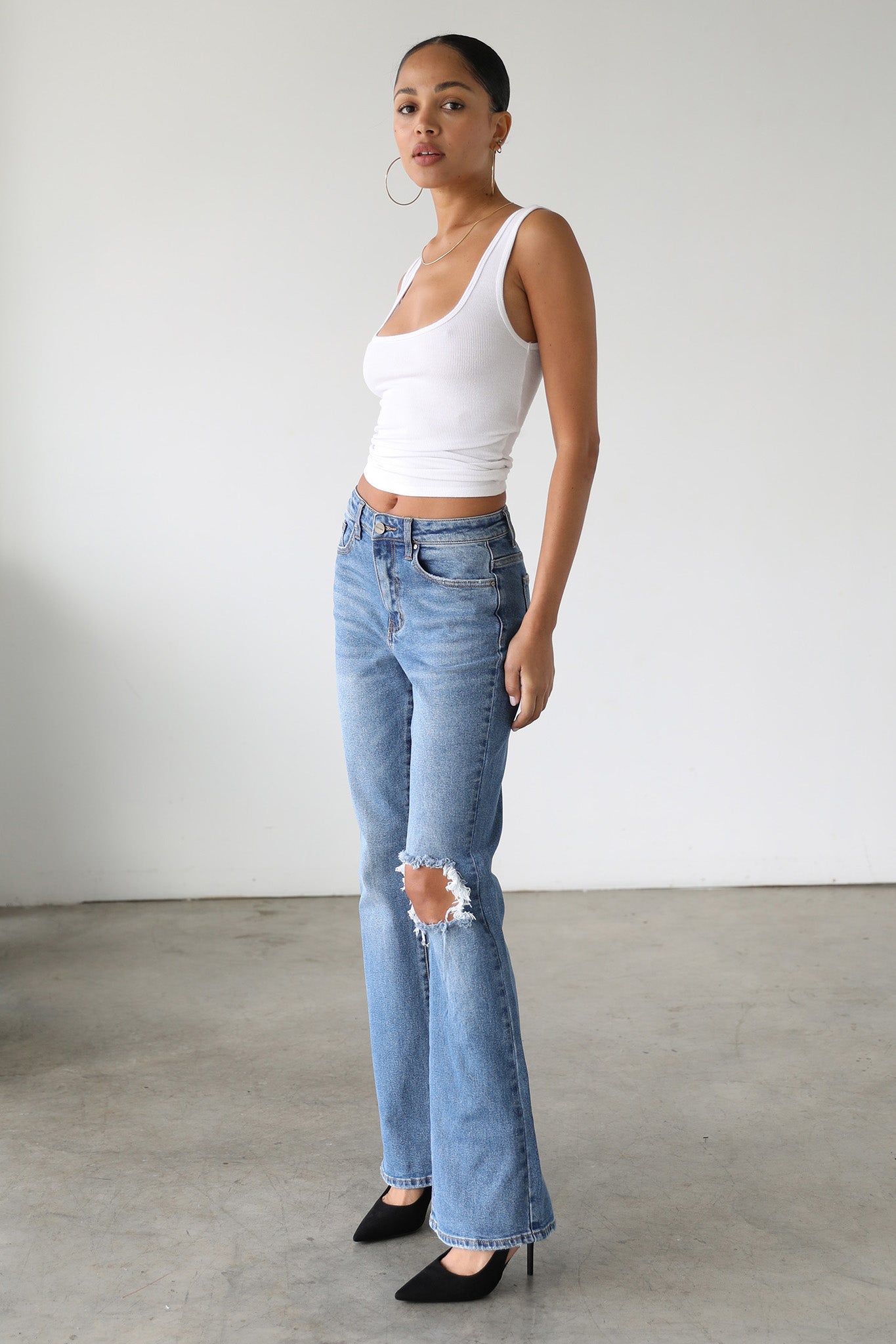 DOGMA DENIM's High Rise Flare Jeans are perfect for a modern, contemporary look. With a timeless, neutral medium wash and a comfortable and flattering flare leg silhouette, they're a versatile style for any occasion. Team them with our Rossana top and boots for a look we are loving.
