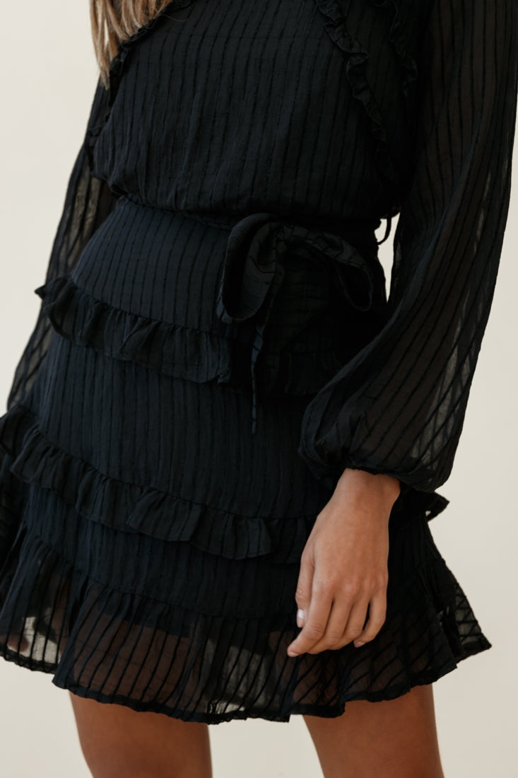 Turn heads in our pretty Dusk dress. Partially lined, it features long sleeves, a round neckline, a waist tie and frill inserts. Perfect for Sunday brunch with your bffs teamed with your favorite mules and a tote.