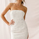 According to Coco, a woman should be two things: classy and fabulous. Our Edith dress is just that. Featuring a classic tweed style fabric that Coco herself would adore and a simple strapless silhouette, this mini dress is perfect for any occasion. We are loving the frayed hemline that gives it a modern twist. Zipper closure at the back.