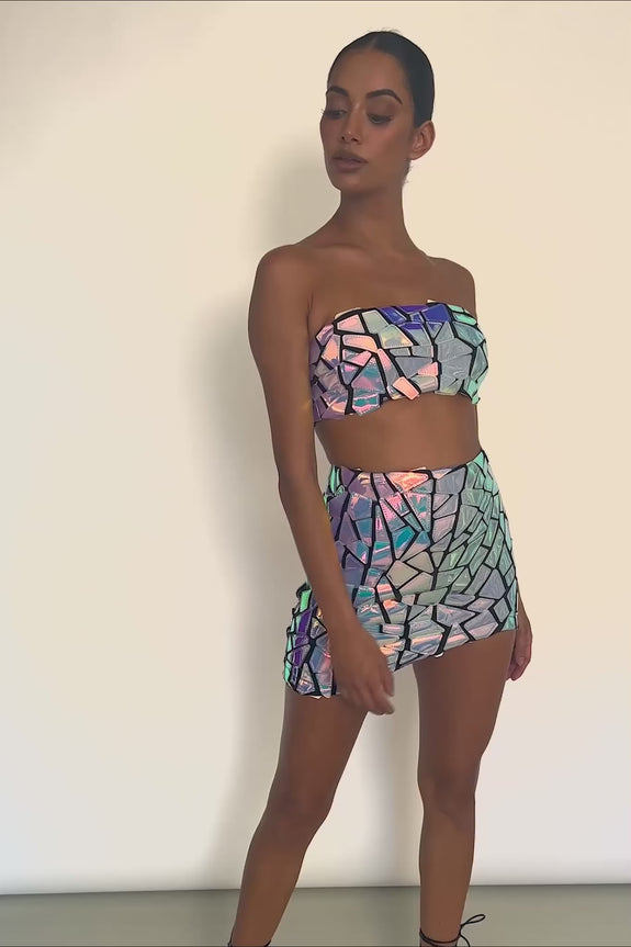 Light up the room in our super hot El Camino mini skirt. We are obsessed with its iridescent, mosaic embellishment! Perfect for a special occasion or birthday celebration. Team it with its matching top and black, platform heels for an unforgettable look.