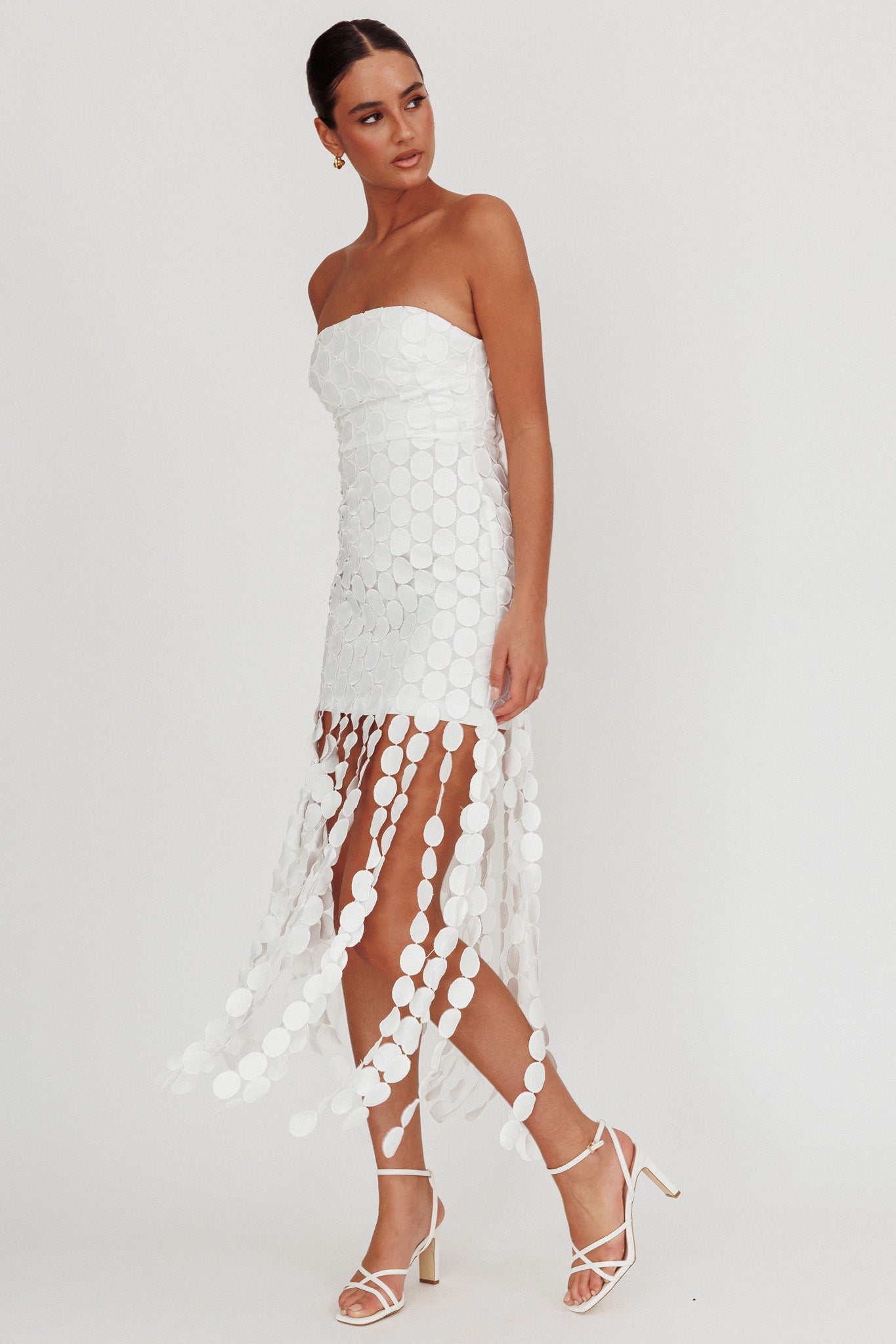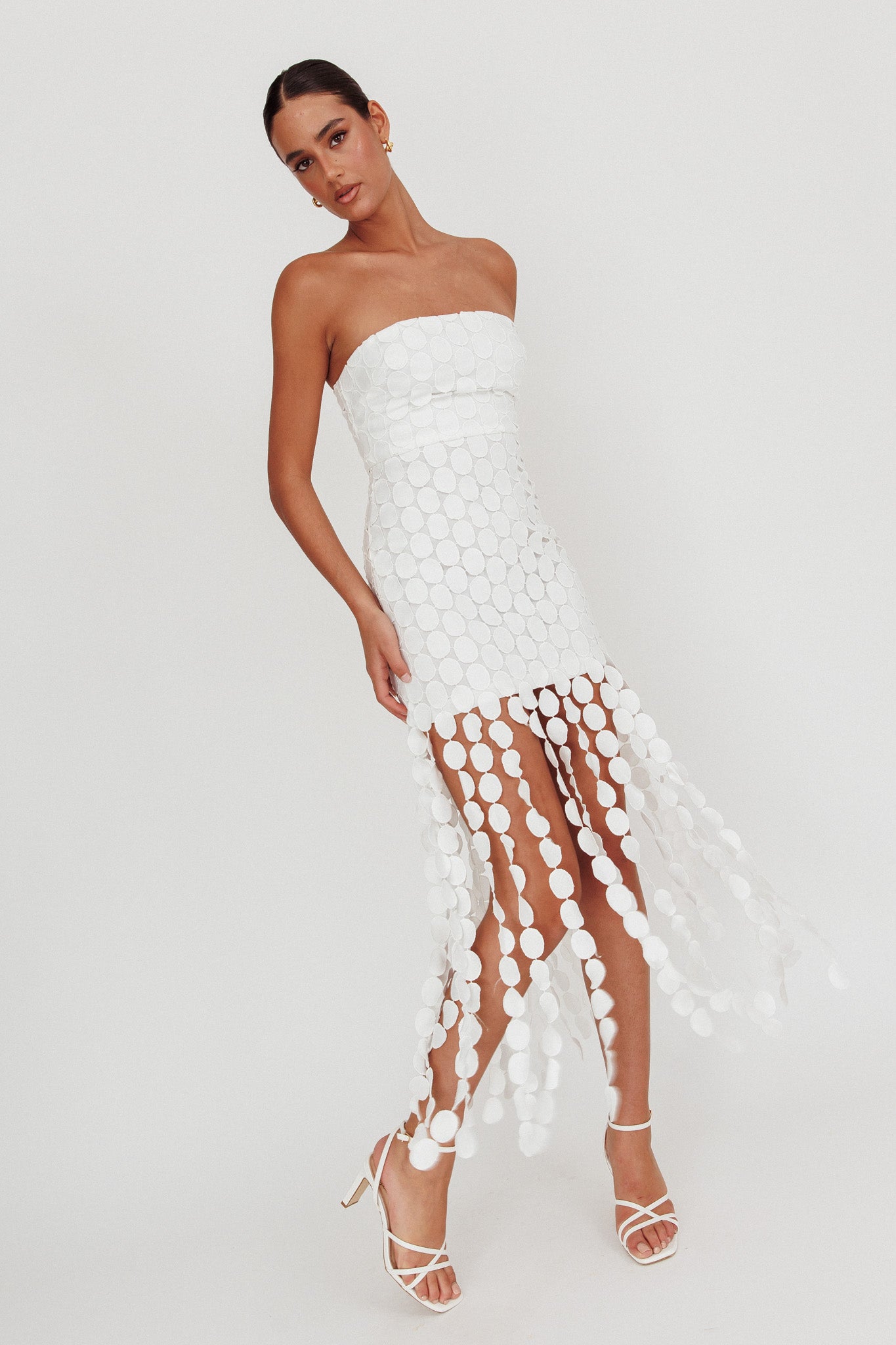 You'll be breaking hearts in this gorgeous little number! Our Elio dress is playful and chic, with it's ankle length circle trim and strapless design. Perfect for a special occasion or prom! Team it with nude heels and your favorite jewelry cause this dress will do all the talking.