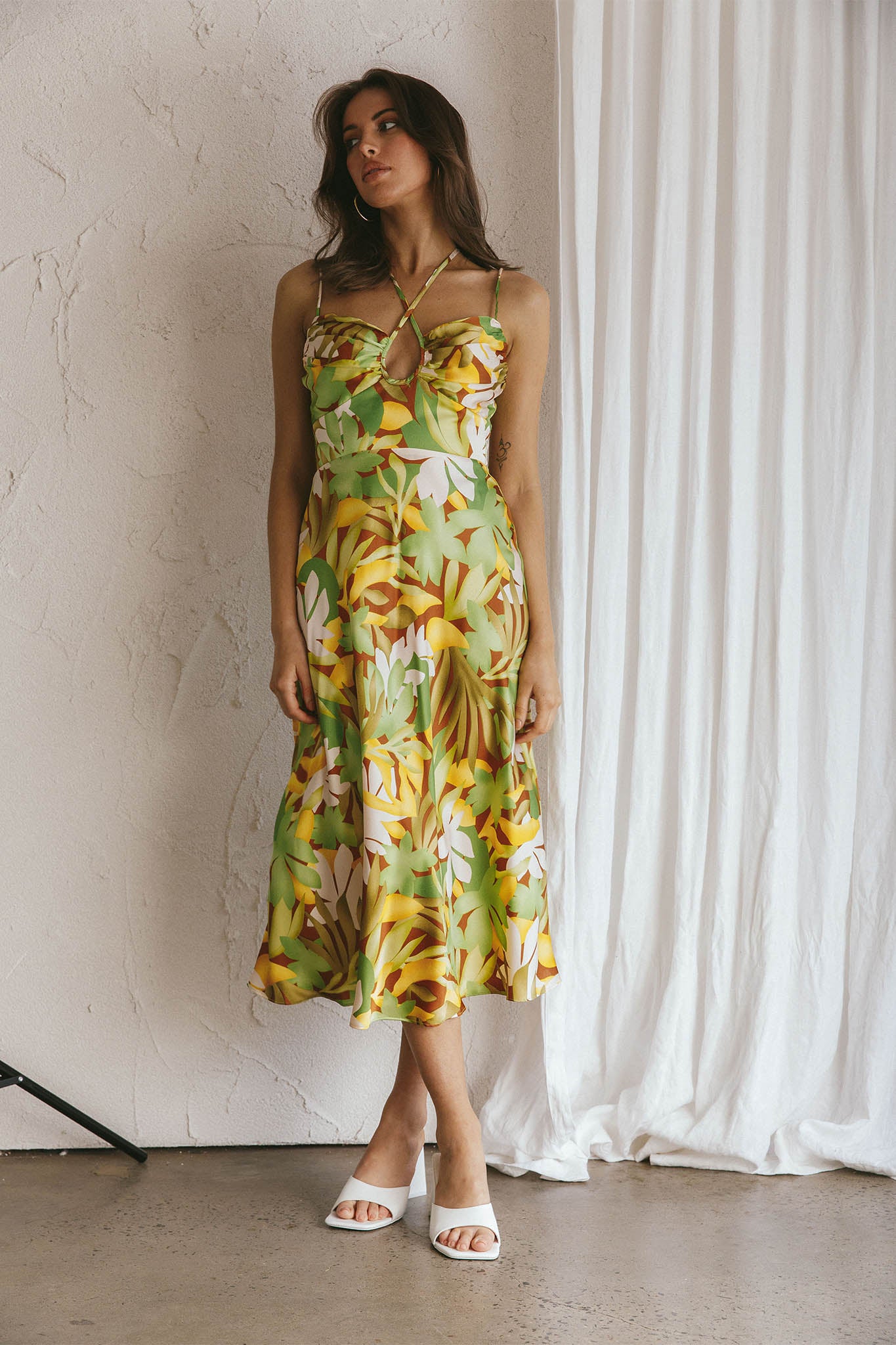 Turn heads in our gorgeous Emmalie midi dress. Featuring a string-tie halterneck and satin fabric, it's perfect for a Friday night dinner with your girls. Team it with mules and a tote for a cute look.