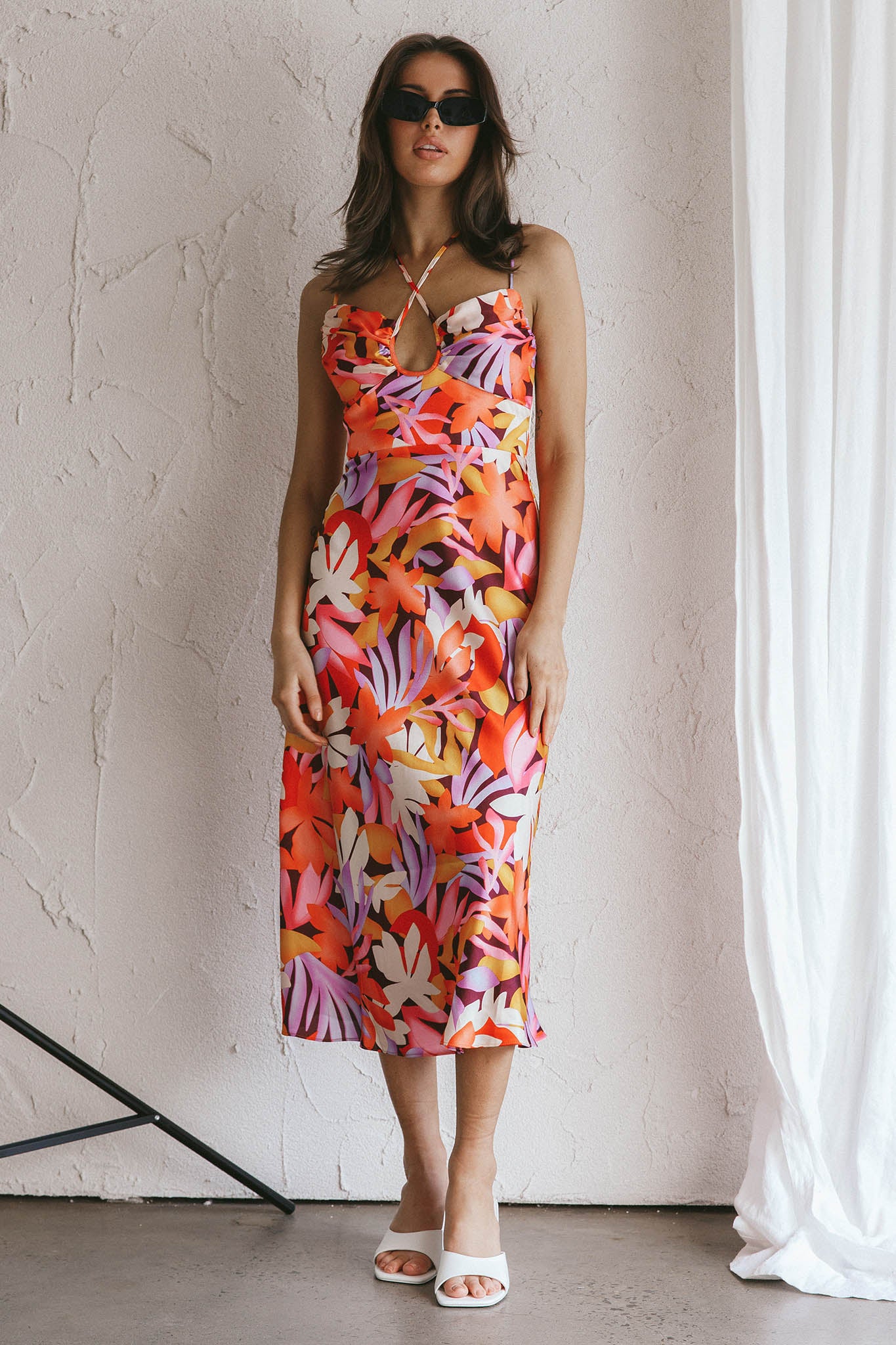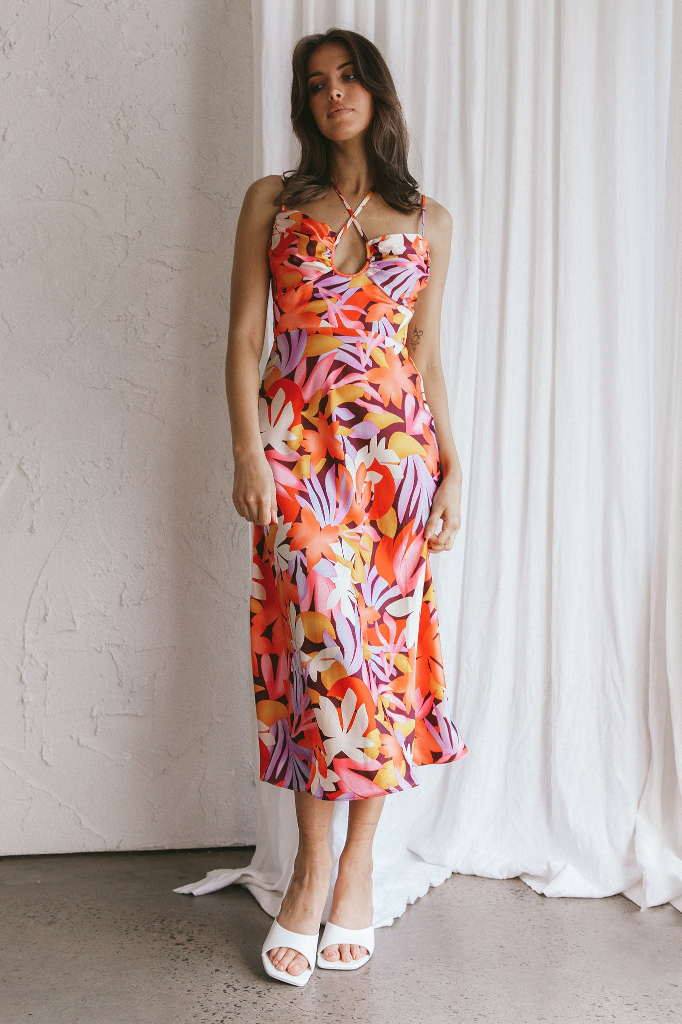 Emmalie Satin Midi Dress Floral Orange