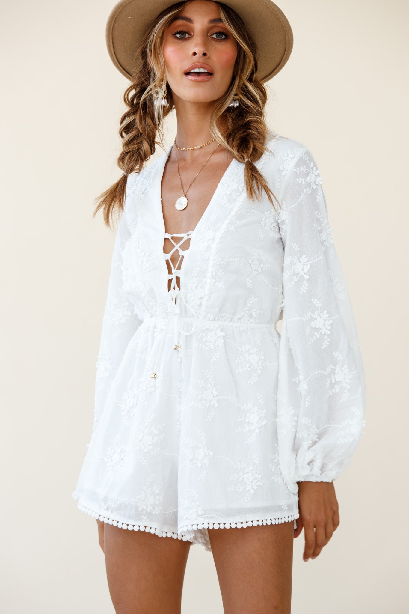 Esperanza Long Balloon Sleeve Floral Embroidery Romper White