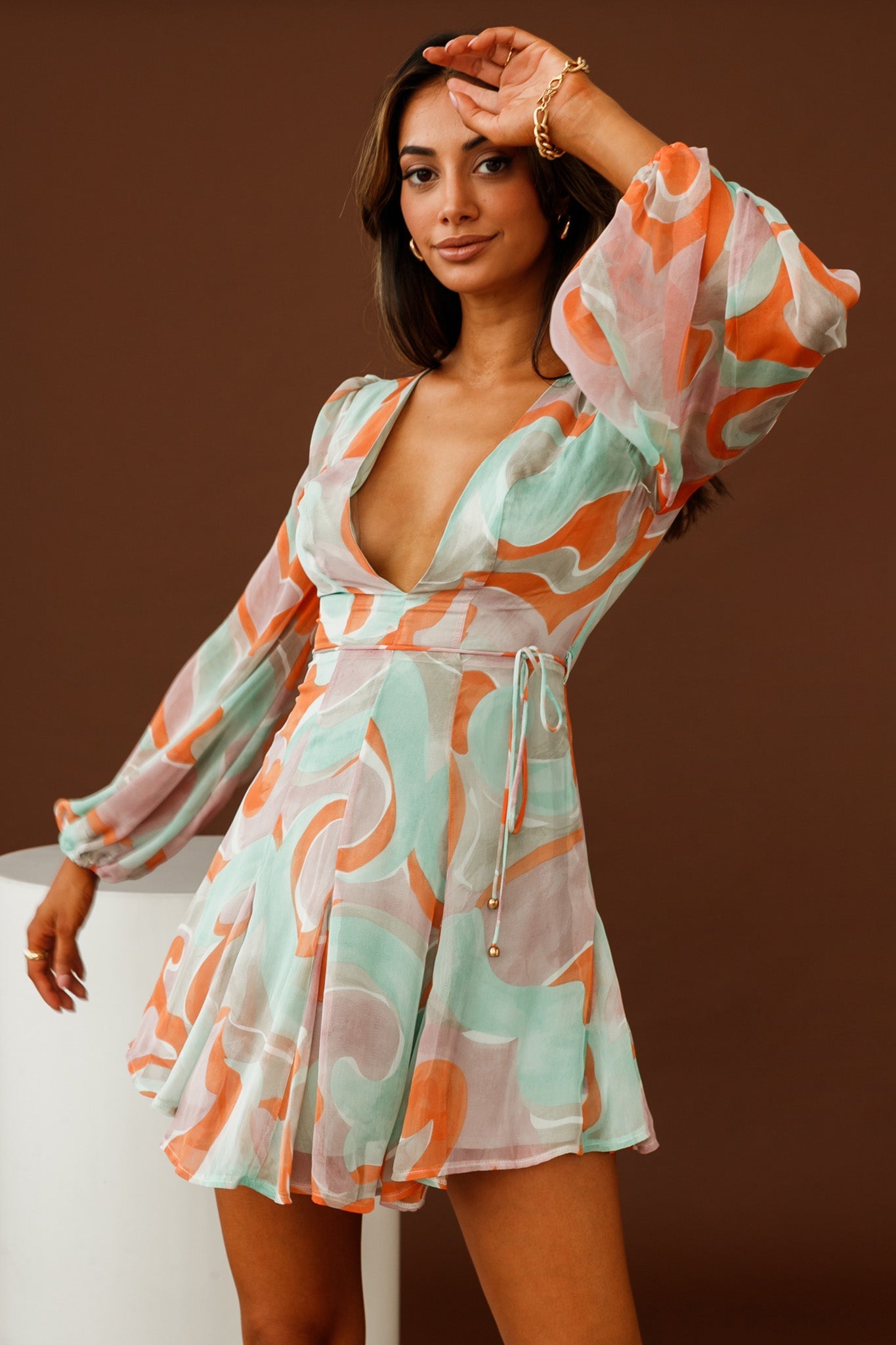 Estelle Long Sleeve V-Neckline Dress Swirl Print Orange/Mint