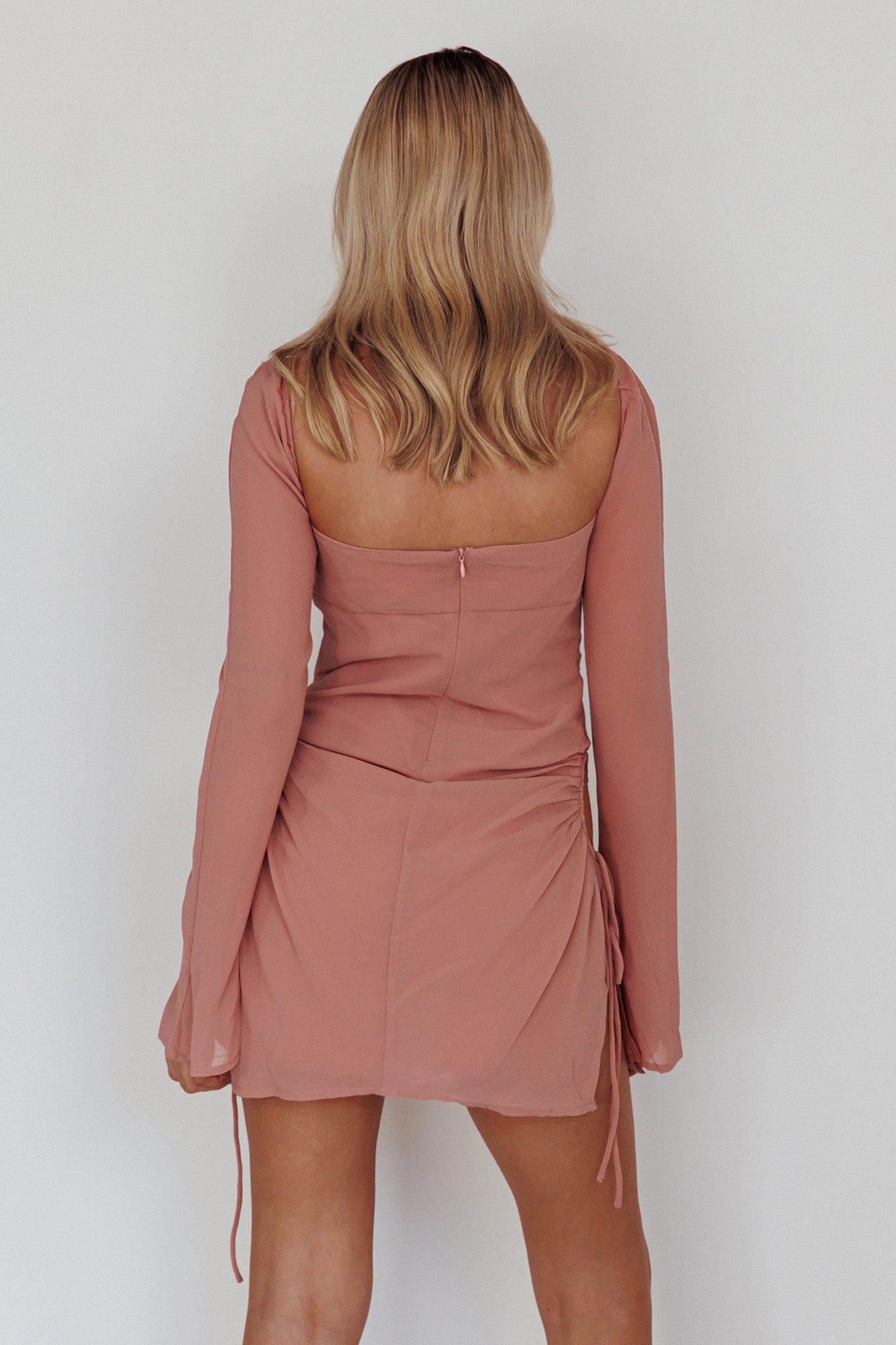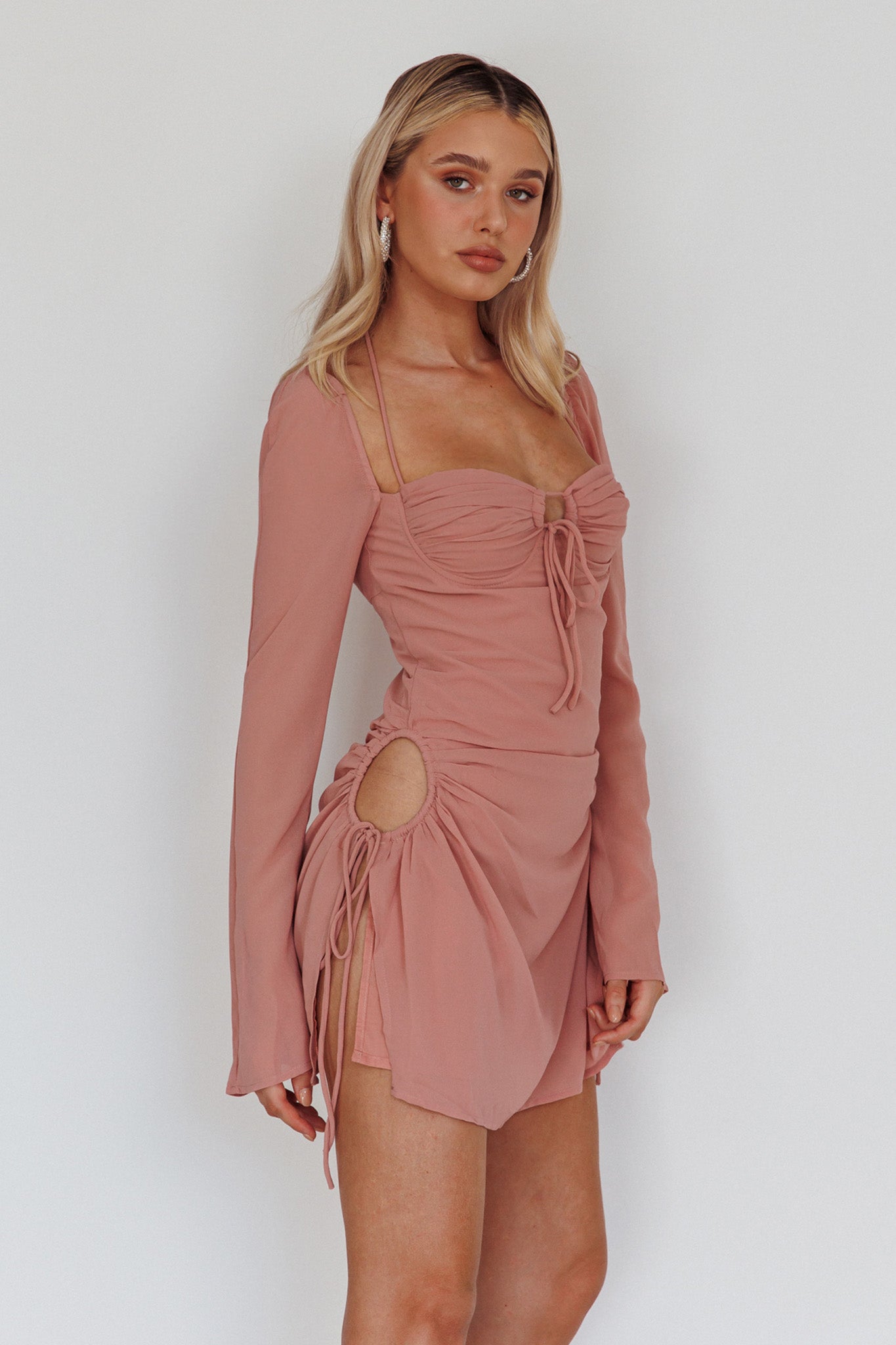 Heads will turn when you strut by in our super cute Etta mini dress. We are obsessed with its flared, long sleeves and drawstring, cut out details. Team it with strappy heels and a clutch for an on-trend look we are all about.