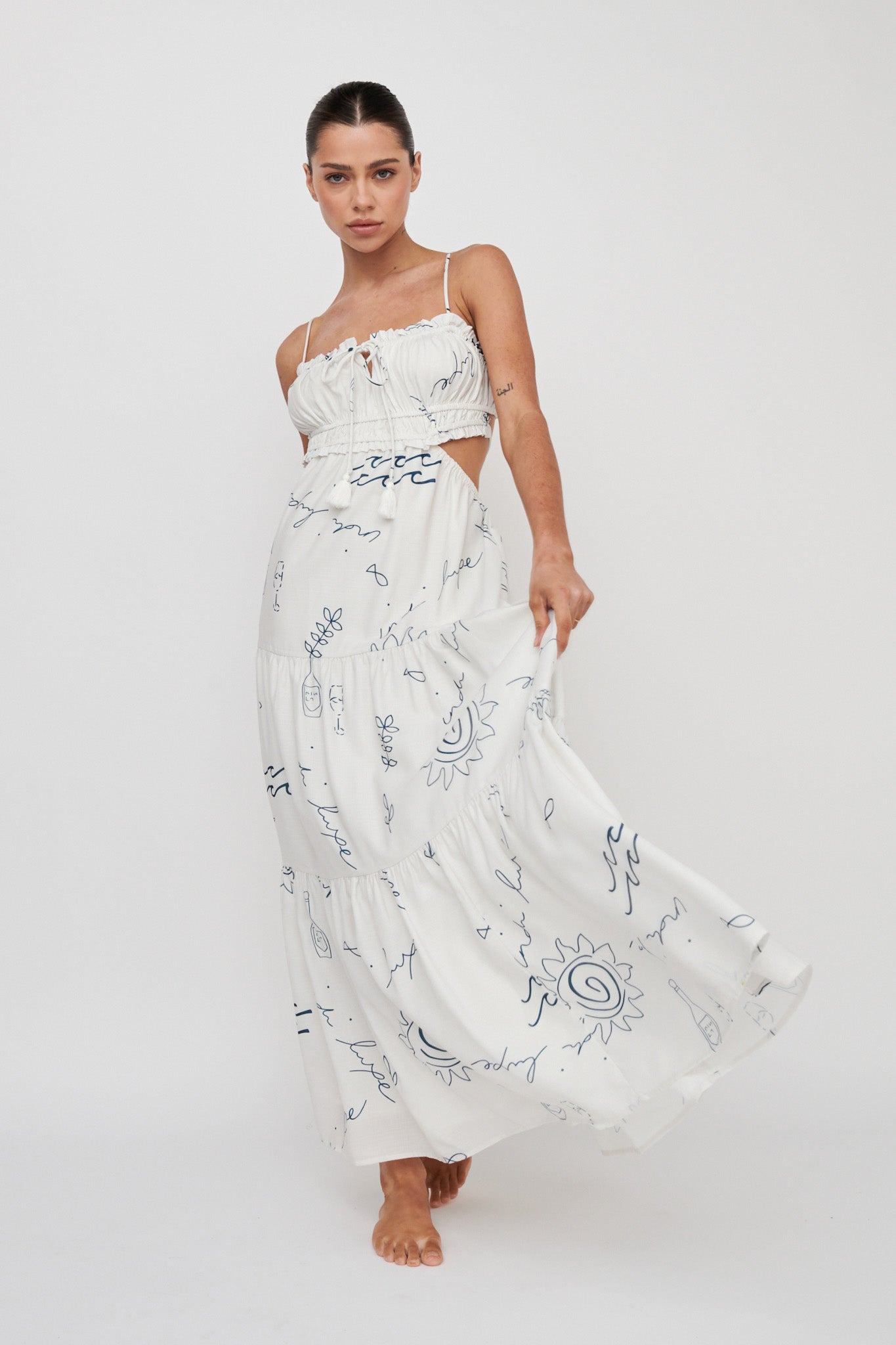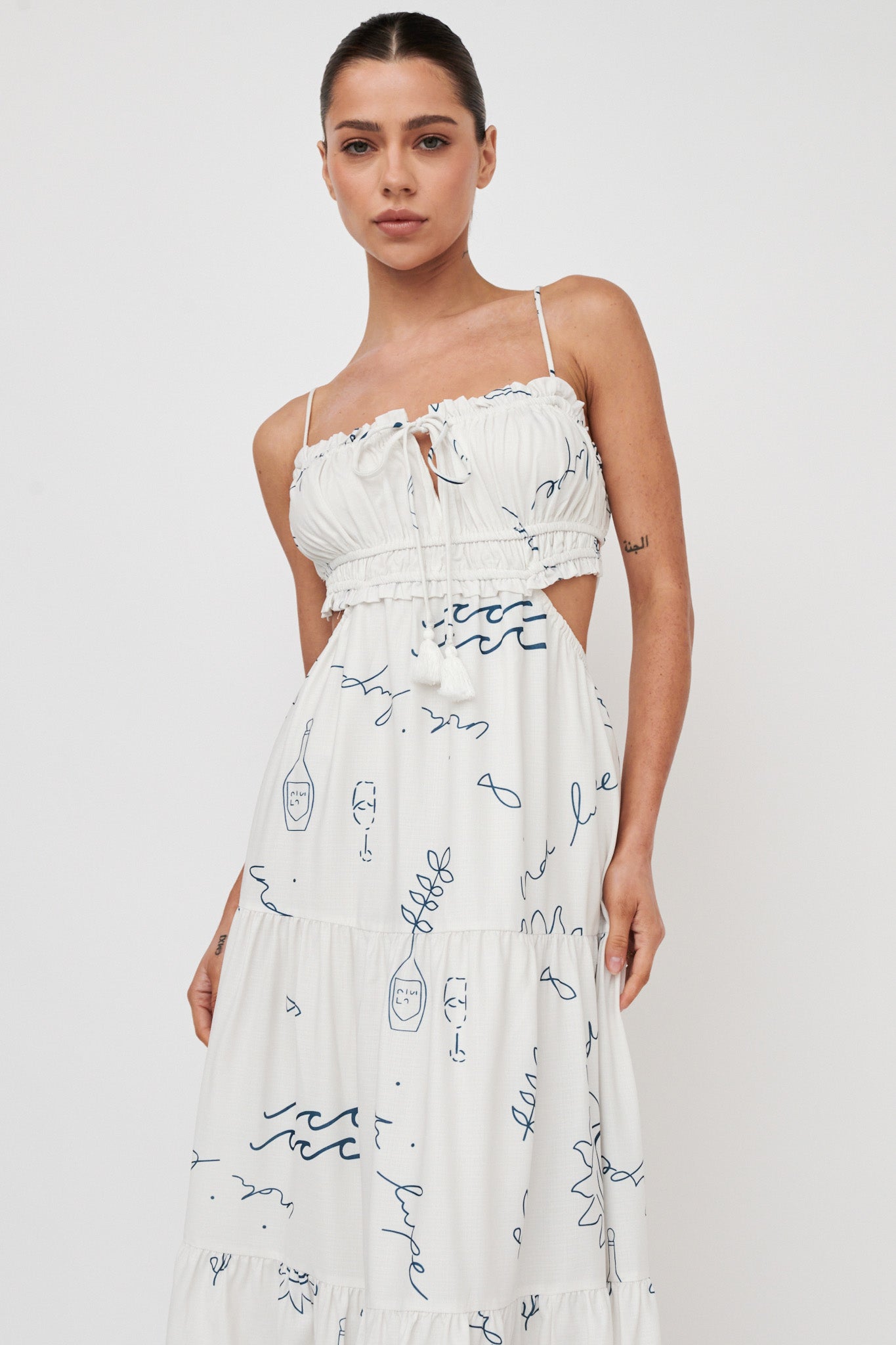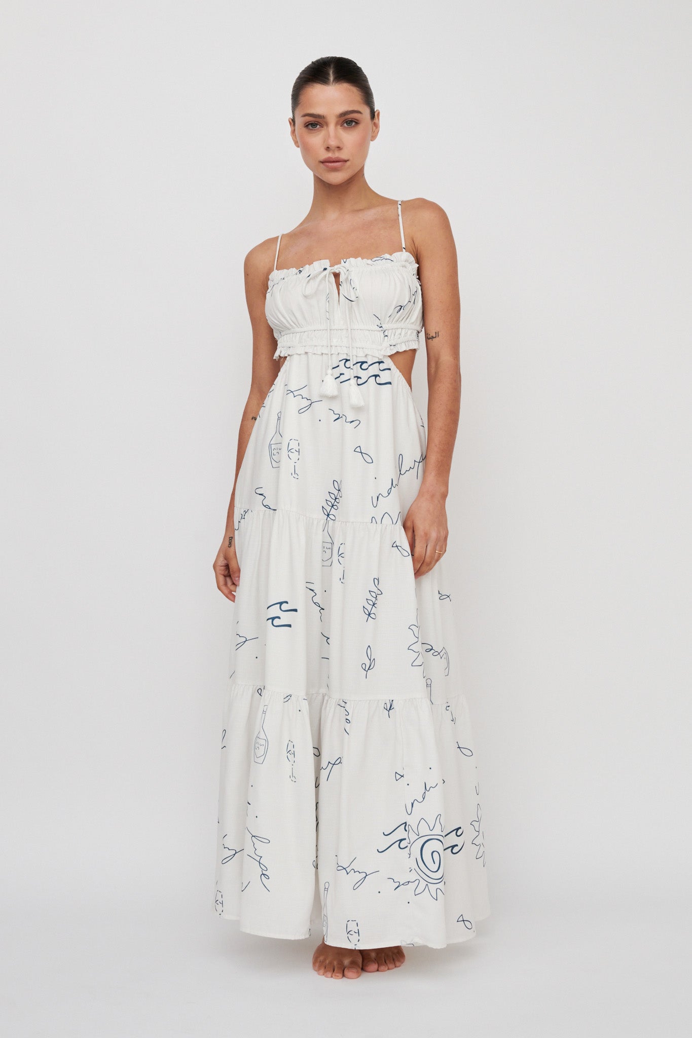 Eyona Cut-Out Back Tie Maxi Dress Print Cream Blue