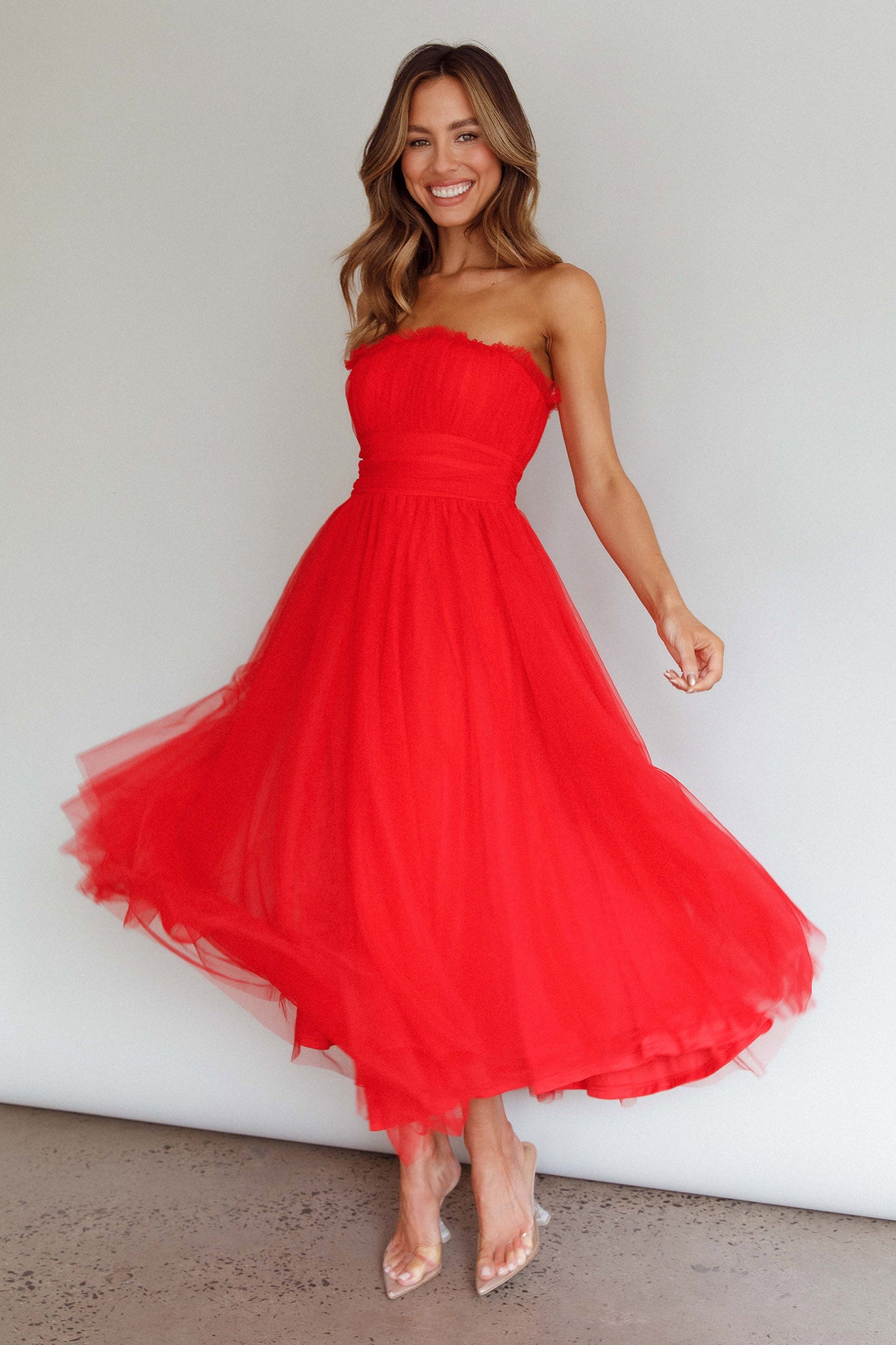 Fayette Strapless Mesh Midi Dress Red