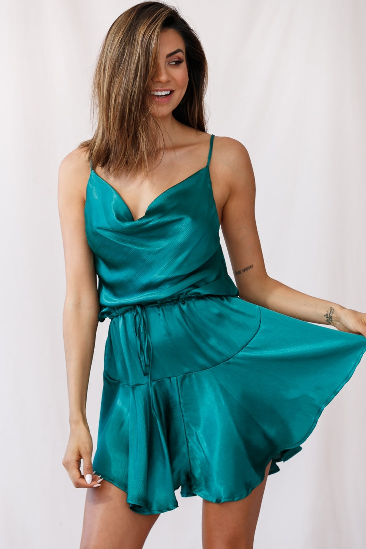 This dress will make you feel like grabbing your besties, a clutch and your favorite heels, and hitting the club for a girls night out. Featuring a flattering cowl neckline, spaghetti straps and adjustable drawstring around the waist for the perfect fit. We are loving the soft, satin-like fabric and fluted hem, perfect for dancing the night away. Team it with nude heels and a cocktail!