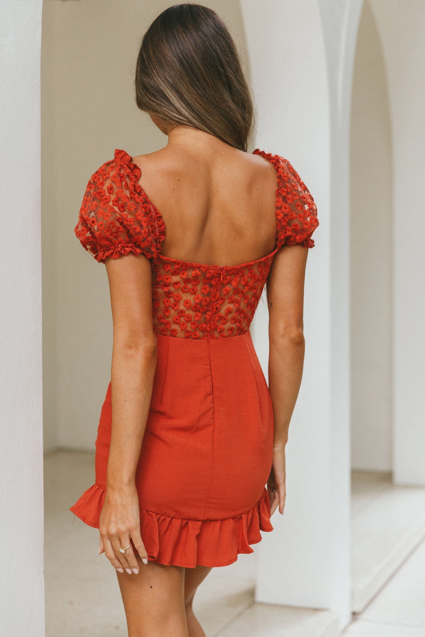Field Dreams Puff Sleeve Tie-Up Bodice Floral Embroidery Mini Dress Rose