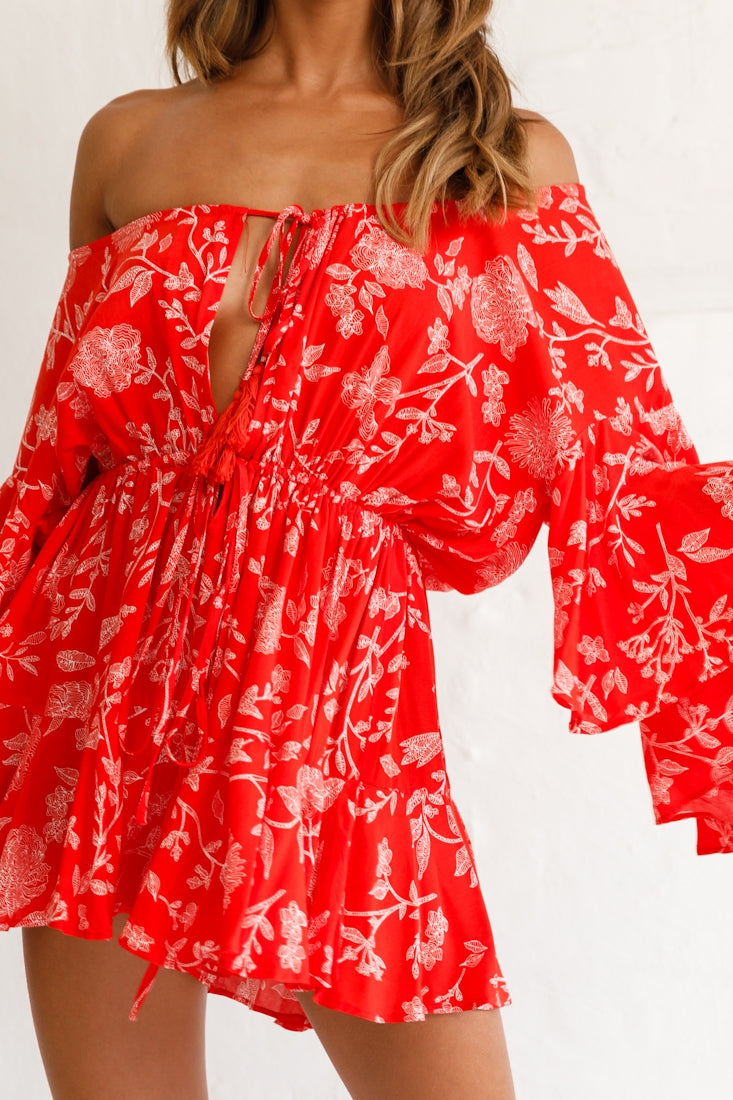 Get everyone's attention in this fiery romper featuring a drawstring waist and neckline and pretty floral print. Perfect for a fun picnic date or Sunday mimosas! Pair it with a wide-brimmed, straw sun hat and tan leather sandals for a cute daytime look.