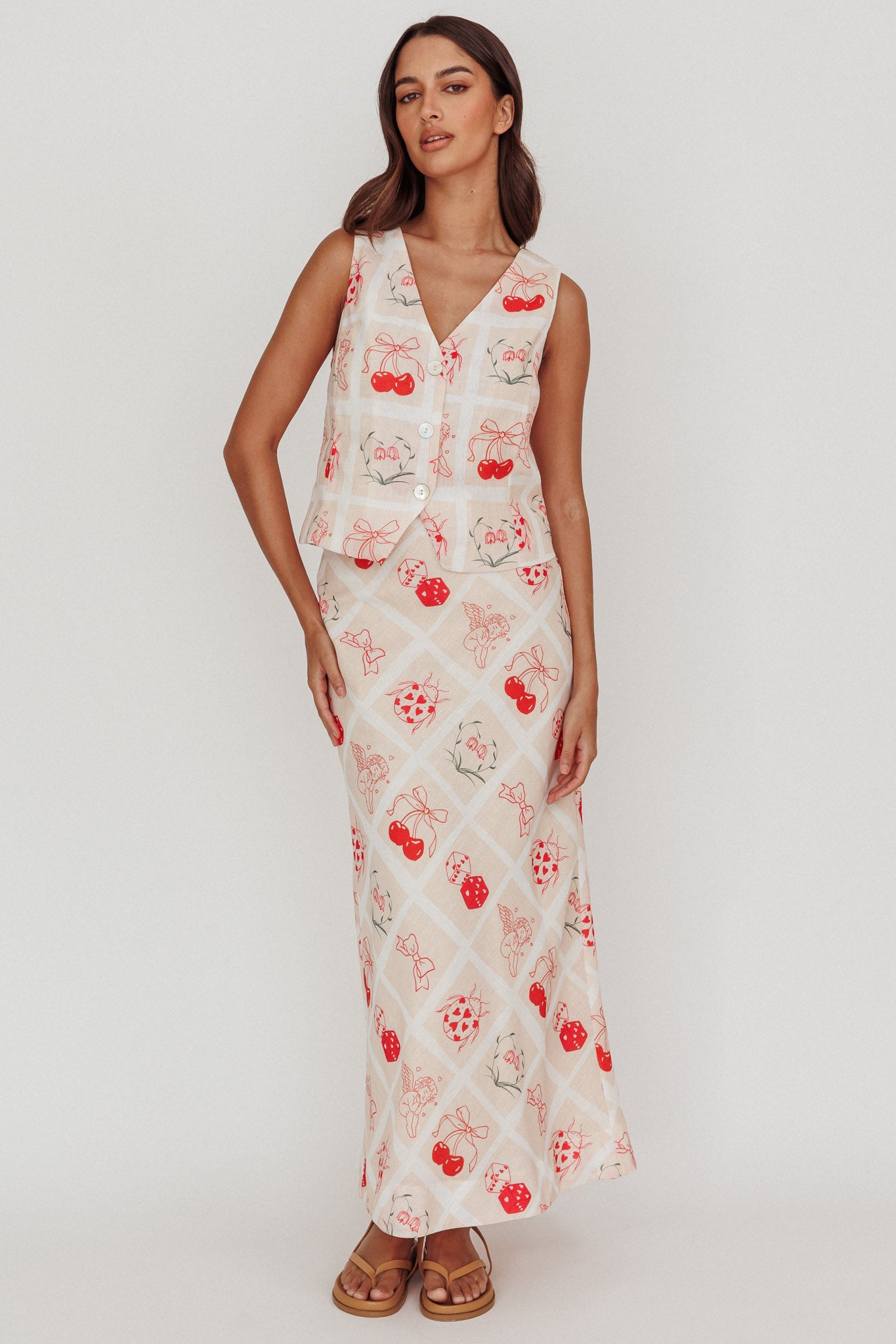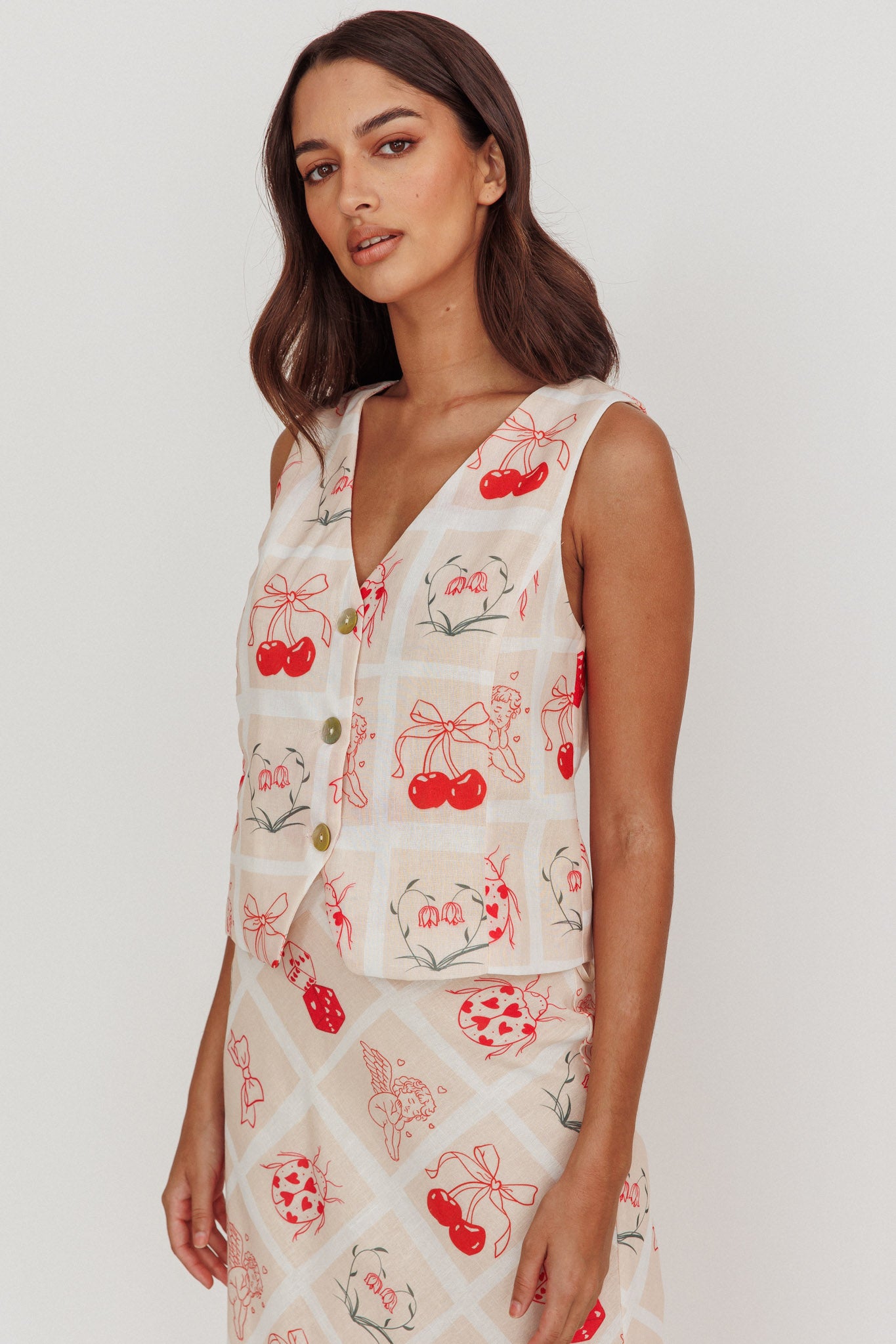 Step into a world of romance with our stunning Flowering vest top adorned in a captivating print. Its sleeveless design offers a comfortable and breathable fit, while the romantic motif print adds a touch of allure. Pair it with the matching skirt or mix and match for endless possibilities.