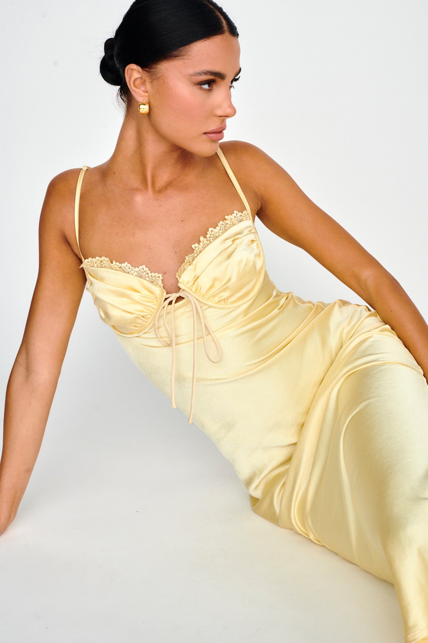 Get ready for some double takes as you walk in wearing our Fortune midi dress. Featuring a lace trim and tie detail in the bust. It's perfect for a glam girls' night out. Team it with perspex heels and a saddle bag for a look we are loving.