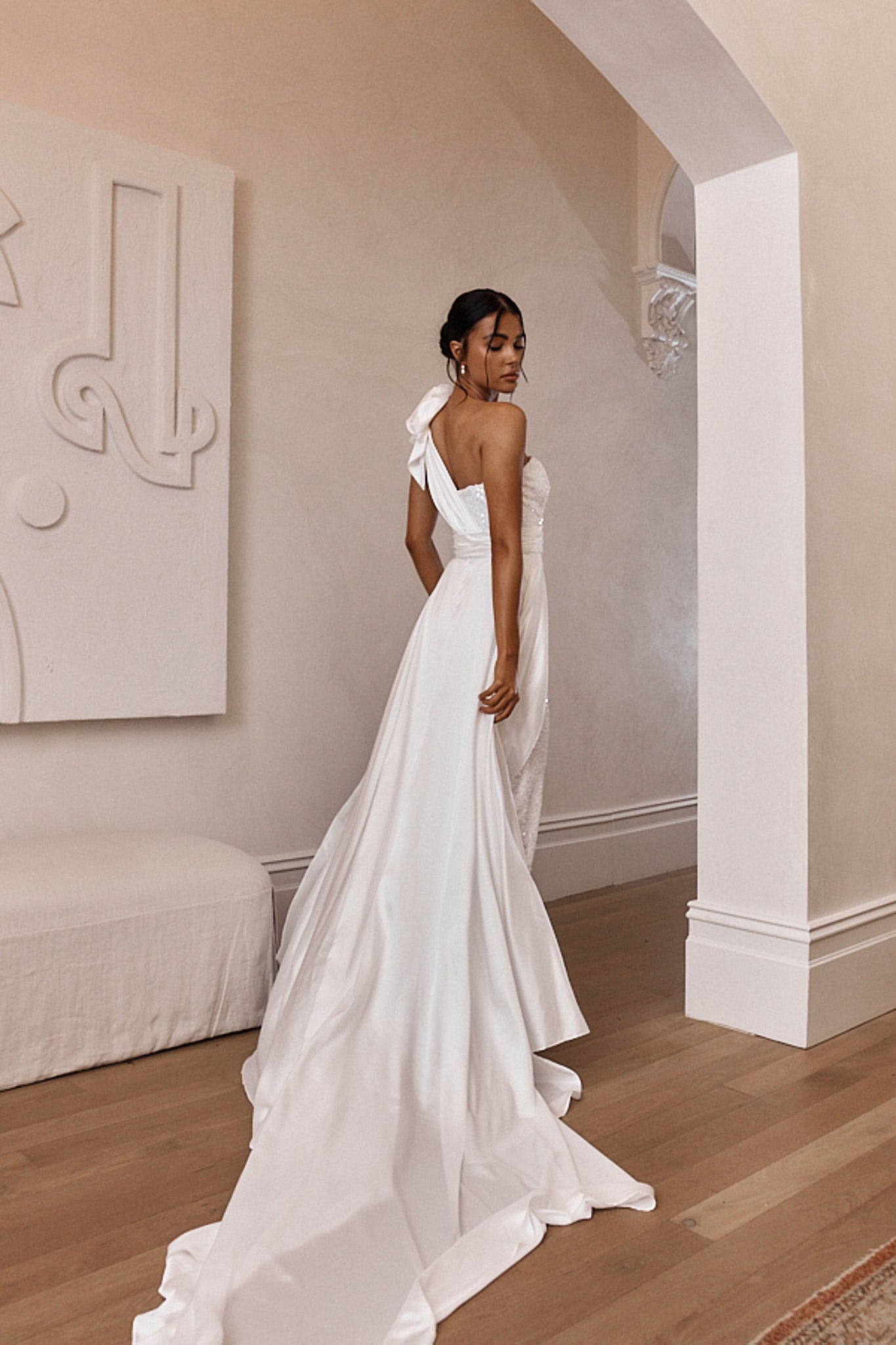 - One shoulder sash/train is a detachable piece that has multi-way use
