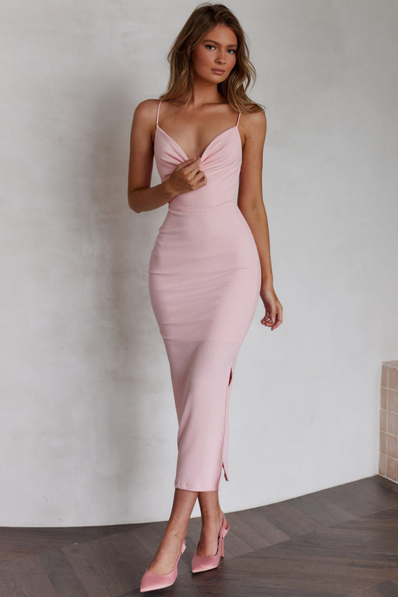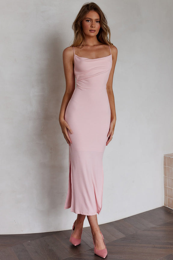 Frieda Cowl Neck Side Split Ribbed Midi Dress Blush