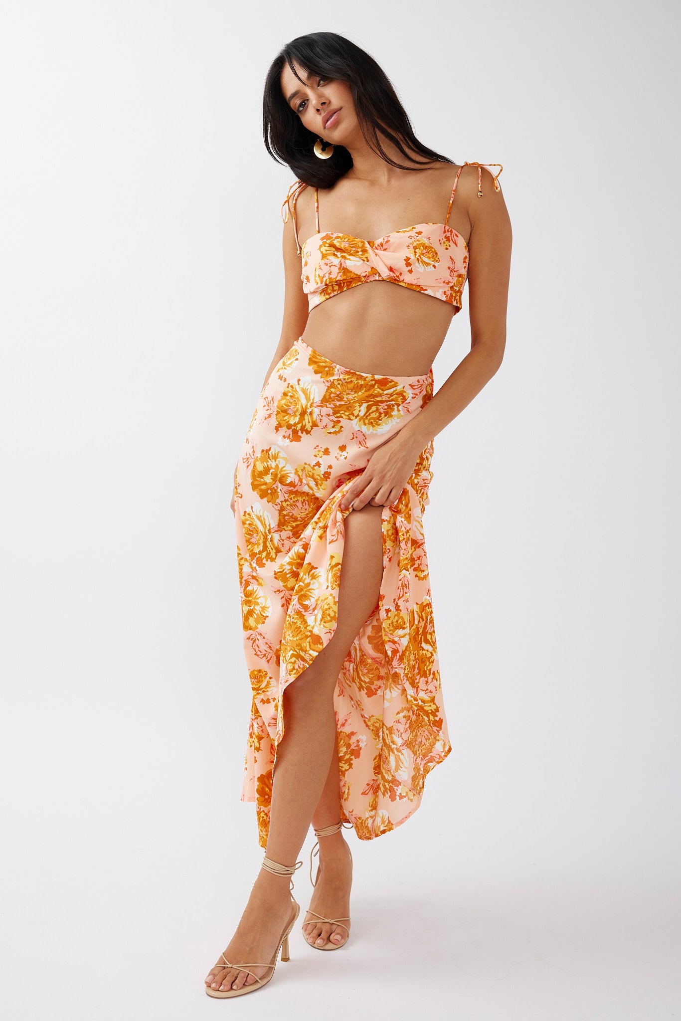 Make an entrance in our gorgeous Gabbi maxi skirt. Featuring a pretty floral print, it's perfect for dinner with your girls. Team it with its matching crop top and diamante heels for a look that's fit for a princess.