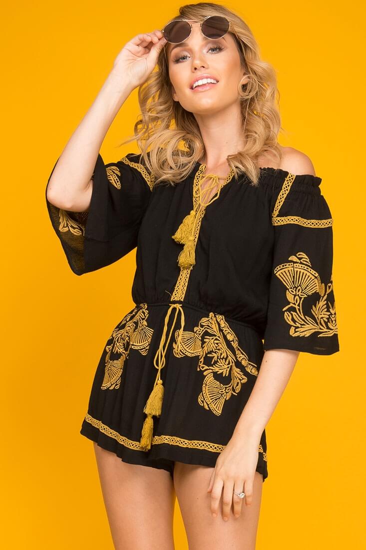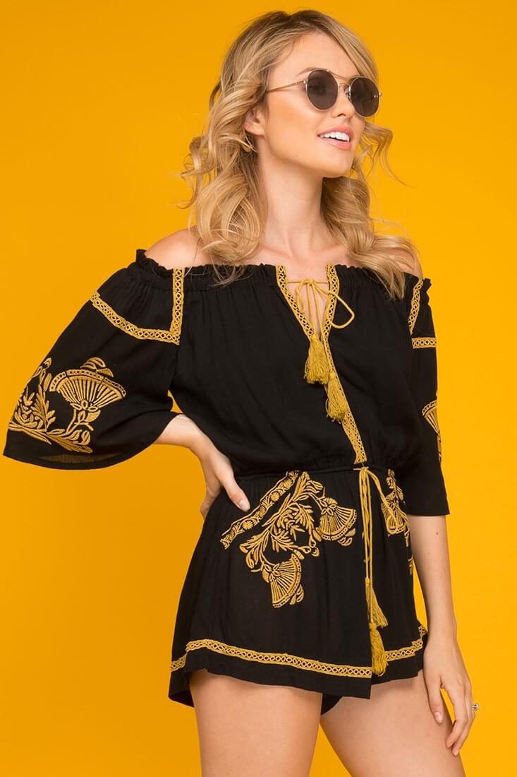 You'll resemble fine art in the Gabrielle Embroidered Tassel Romper. Deep, bold colors mixed with embroidered design and tassels along the waist and bust line will be the cute and casual look you love on the next museum date.