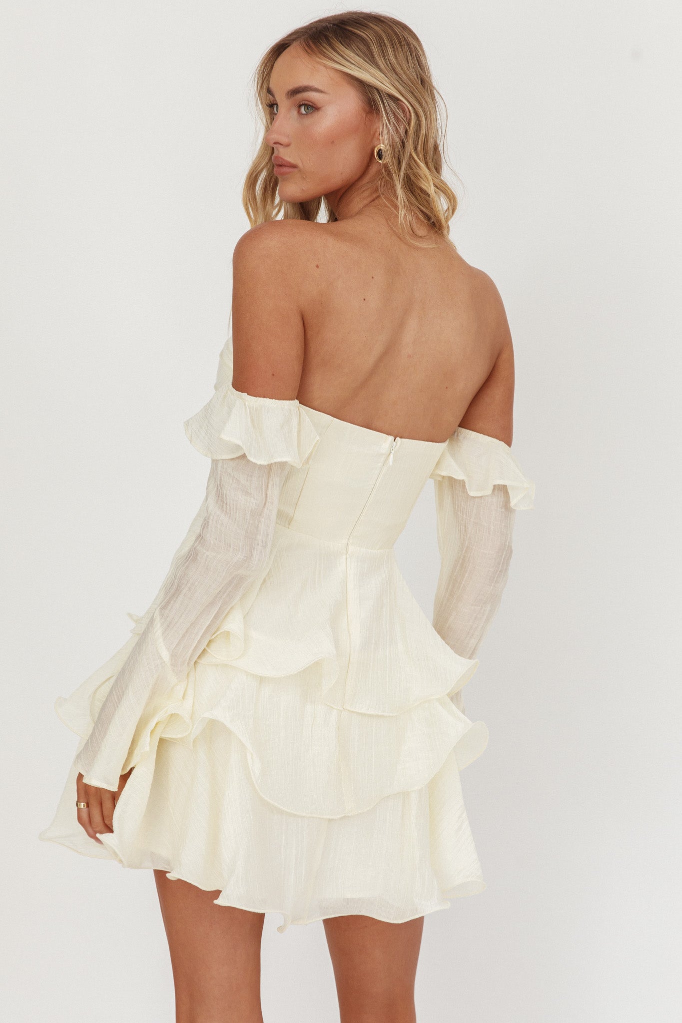 Make an entrance in our stunning Giavana mini dress. It features off-shoulder long sleeves and tiered layers throughout. It's perfect for a bridal shower or a special event. Team it with strappy, nude heels and a clutch for a look that is unforgettable.