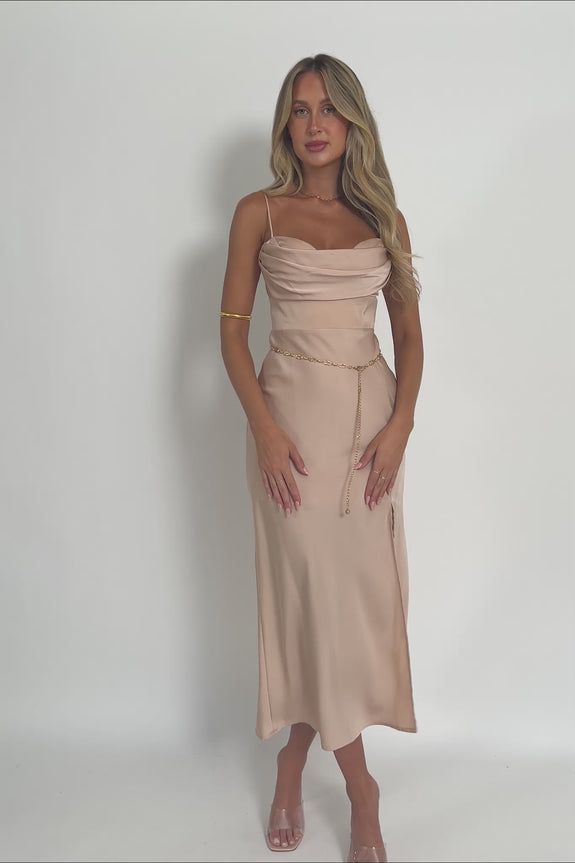 Call off the search. This is the one you've been looking for! We are in love with our gorgeous Giorgette midi dress. Featuring gathering in the bust and a sexy split in the side. Perfect for a wedding or a special occasion. Team it with strappy, tie-up heels and a clutch for an unforgettable look.