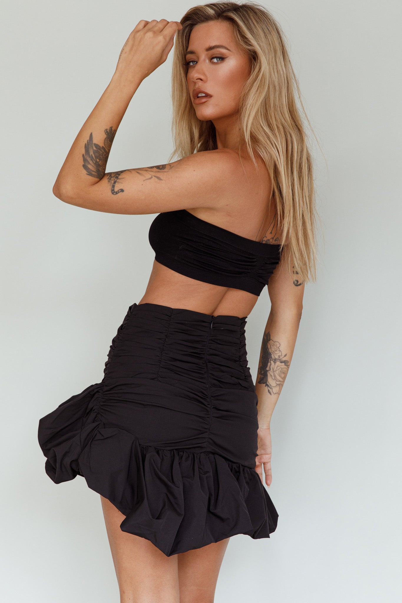 Elevate your look with our chic Gloria mini skirt. We are in love with the puffed hem and ruching detail. Team it with a crop top and mules and get ready to hit the dancefloor with your girls!