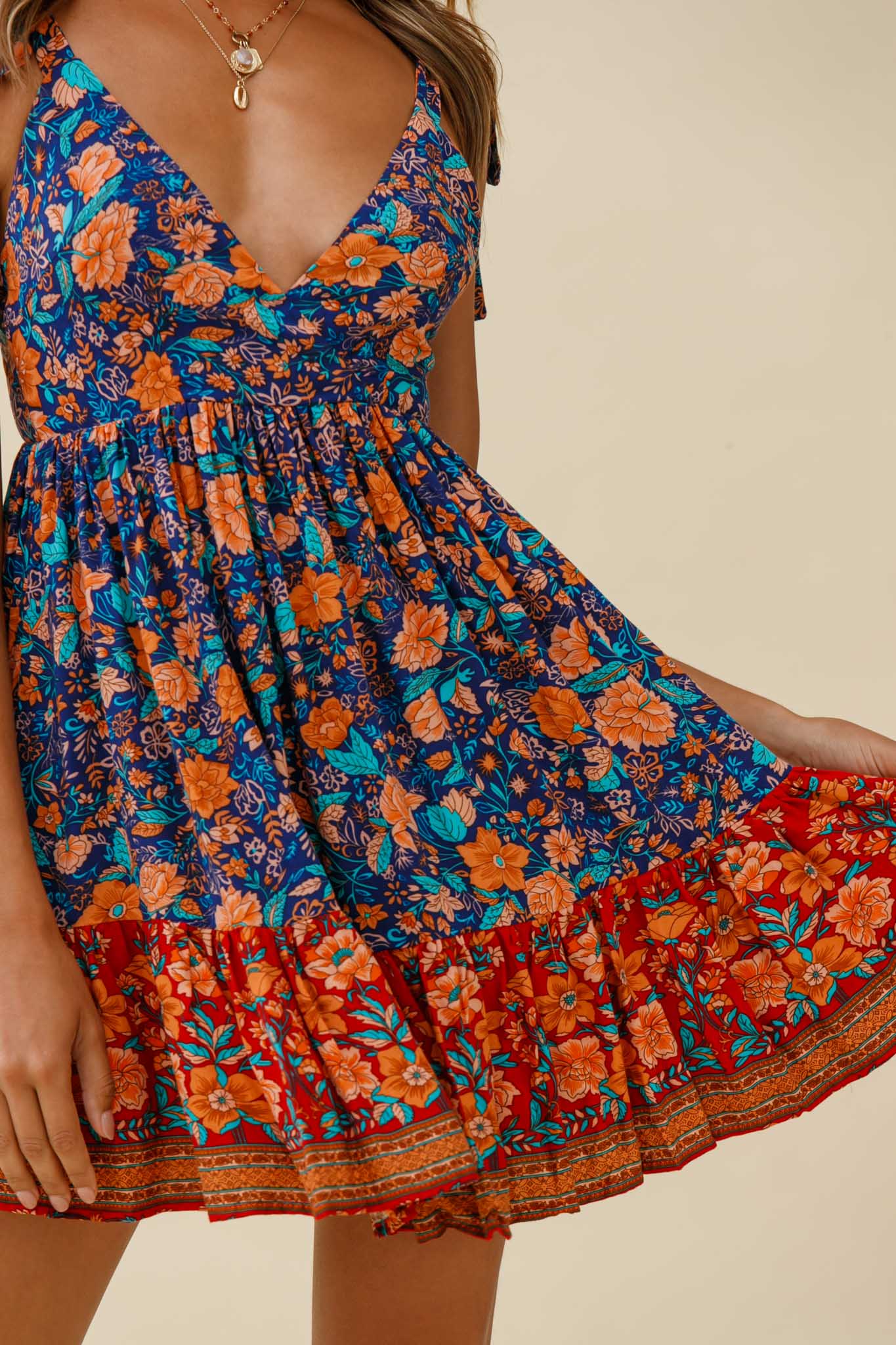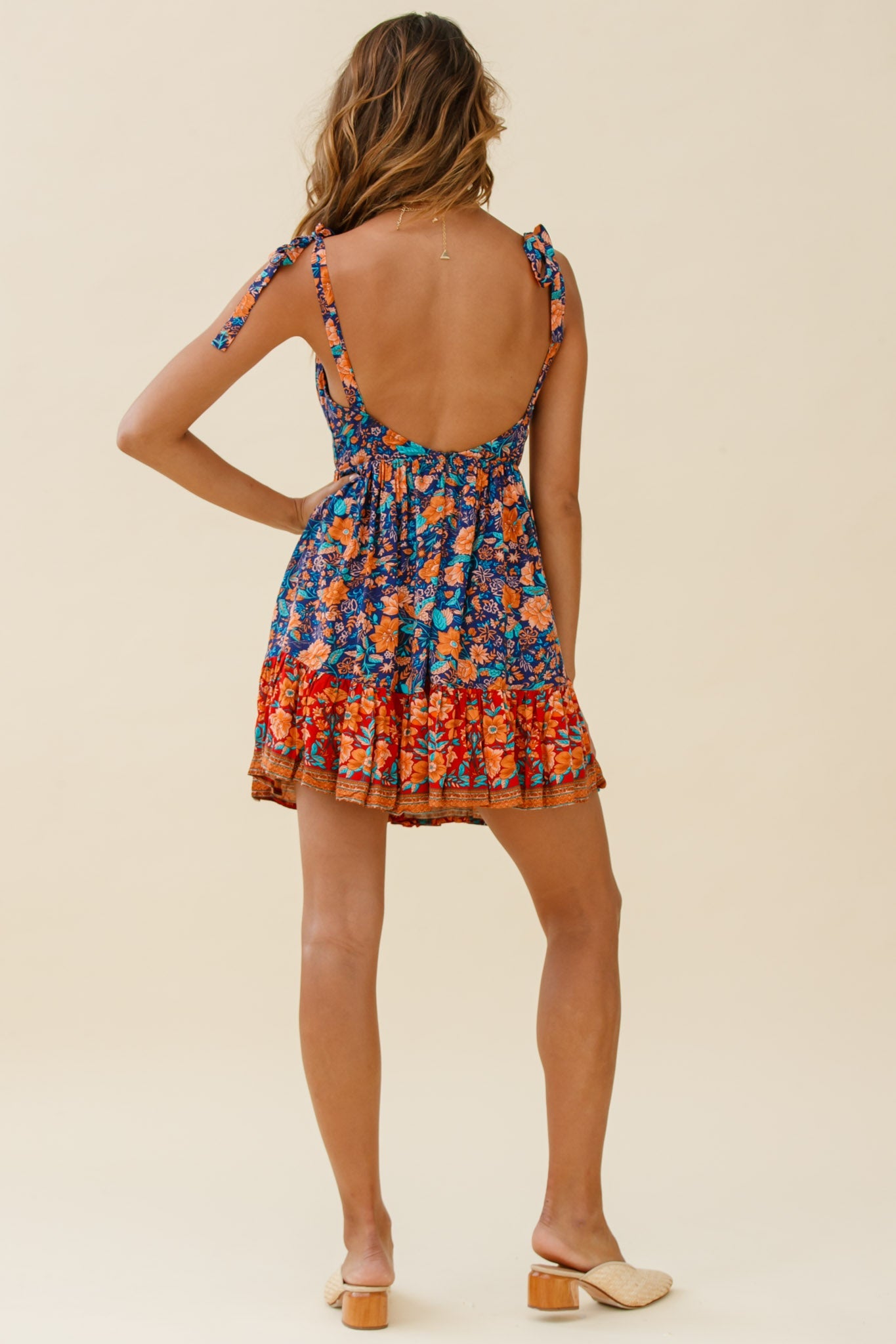 Go Get It Tied Shoulder Sun Dress Floral Print Navy