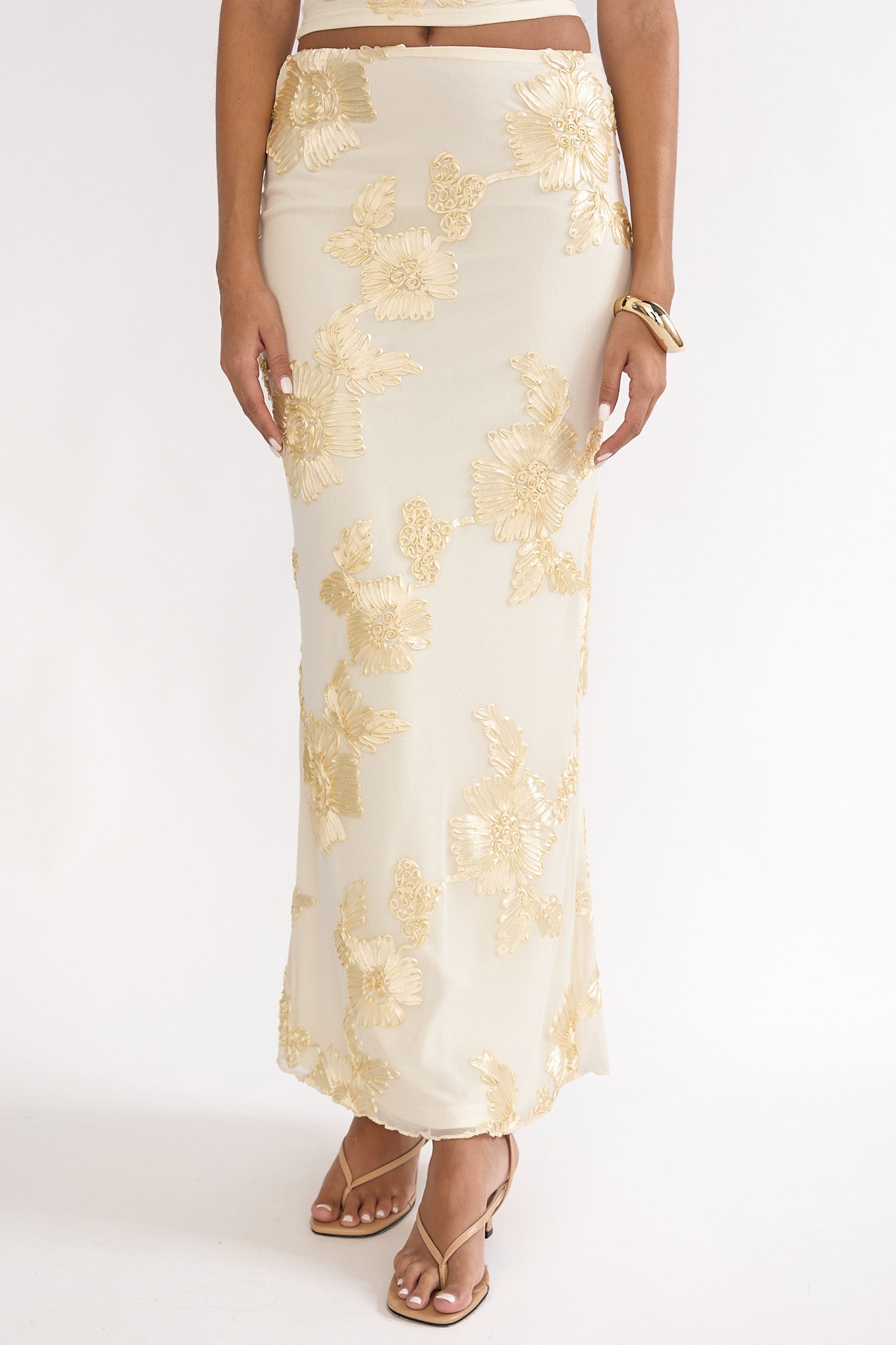 Steal the show with our stunning Golden Hours maxi skirt. Featuring the prettiest floral embellishment, it's just what you need for your next big event or birthday celebration. Team it with its matching top and silver heels for an unforgettable look.
