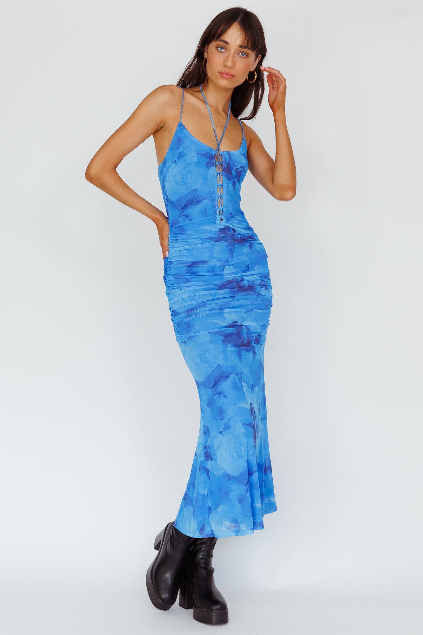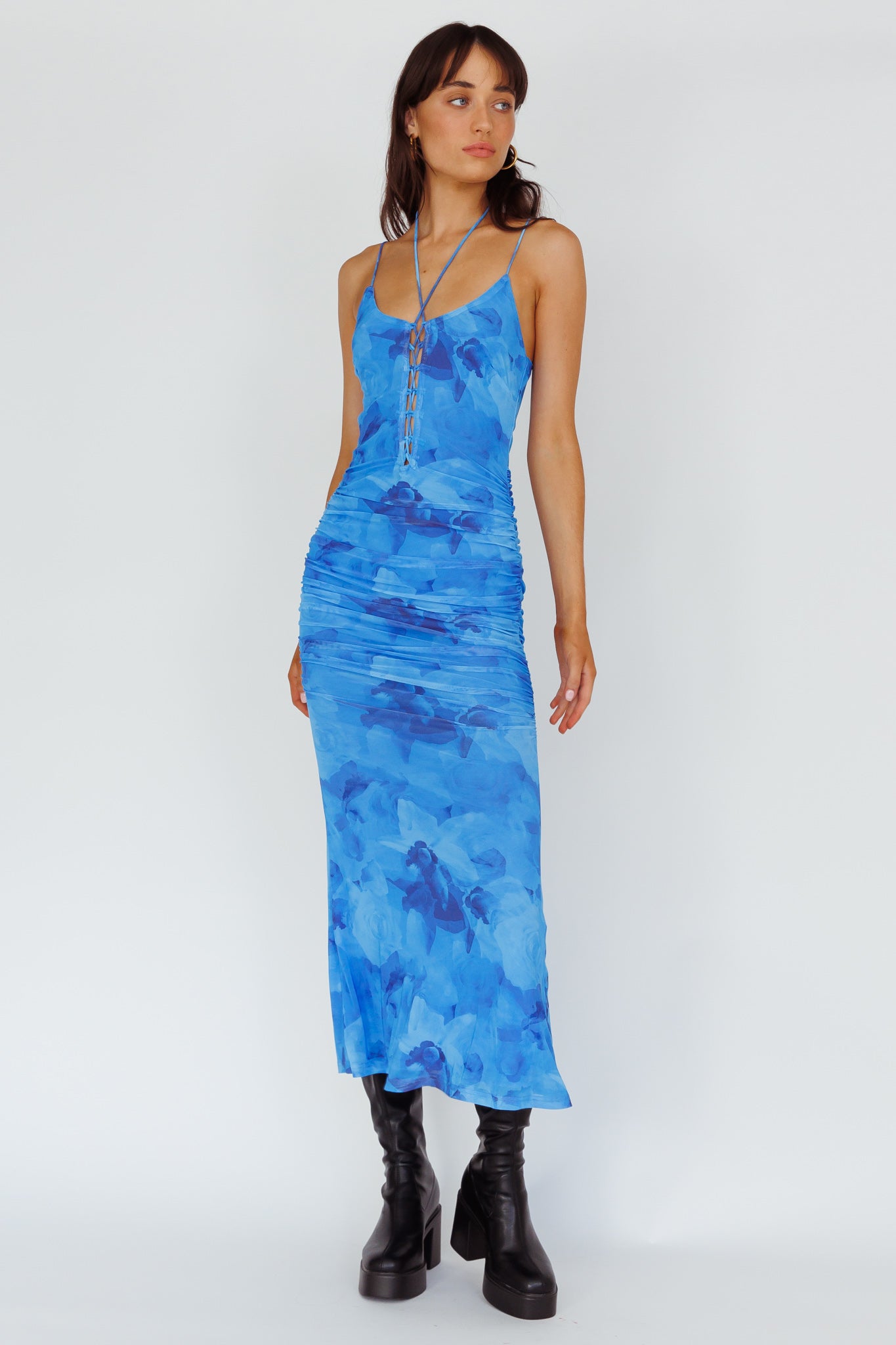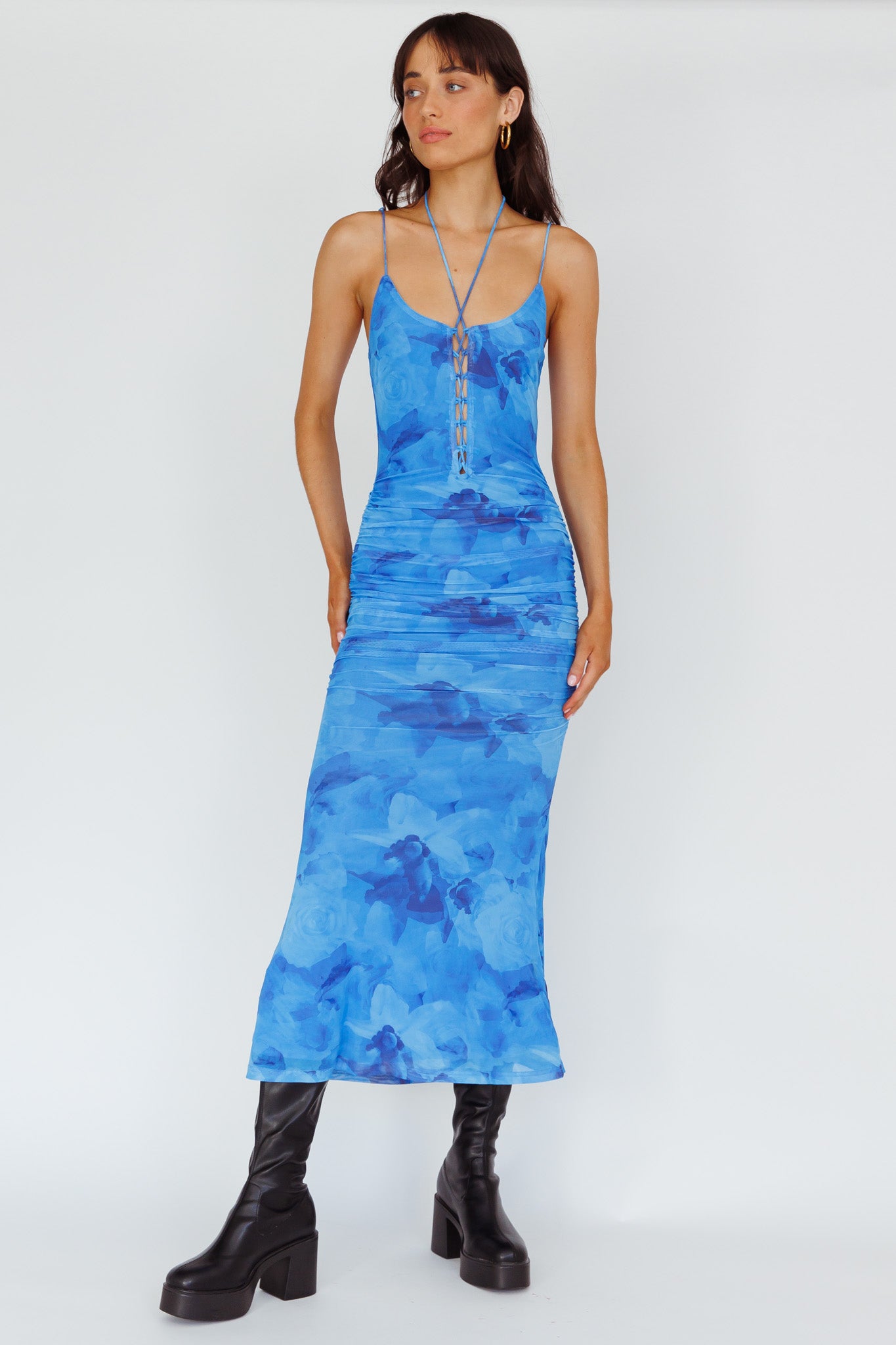 Steal the spotlight in our pretty Gypsy Garden midi dress. Featuring ruched sides and a lace-up feature in the bodice. It's perfect for a girls' night out teamed with platform mules and a purse.