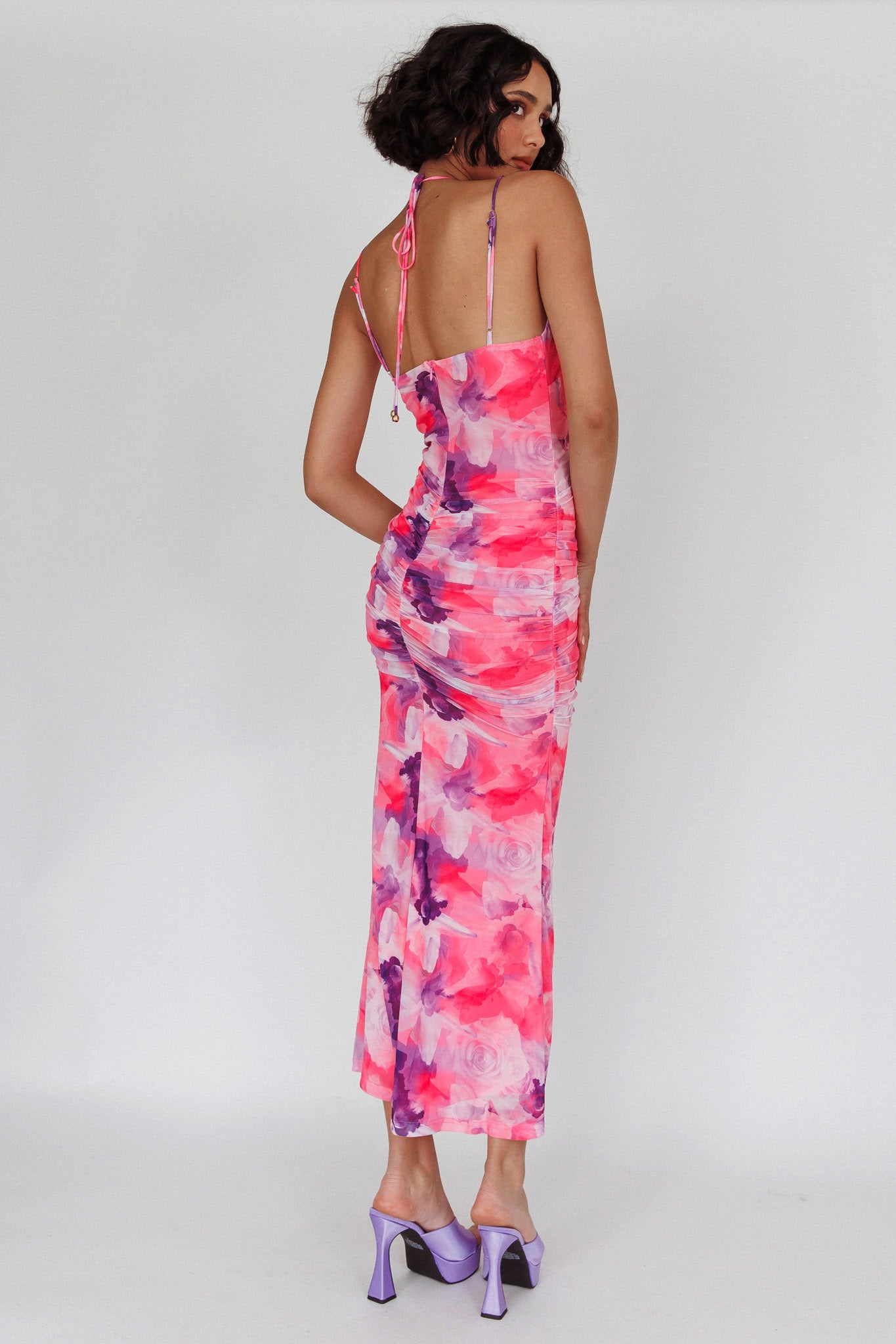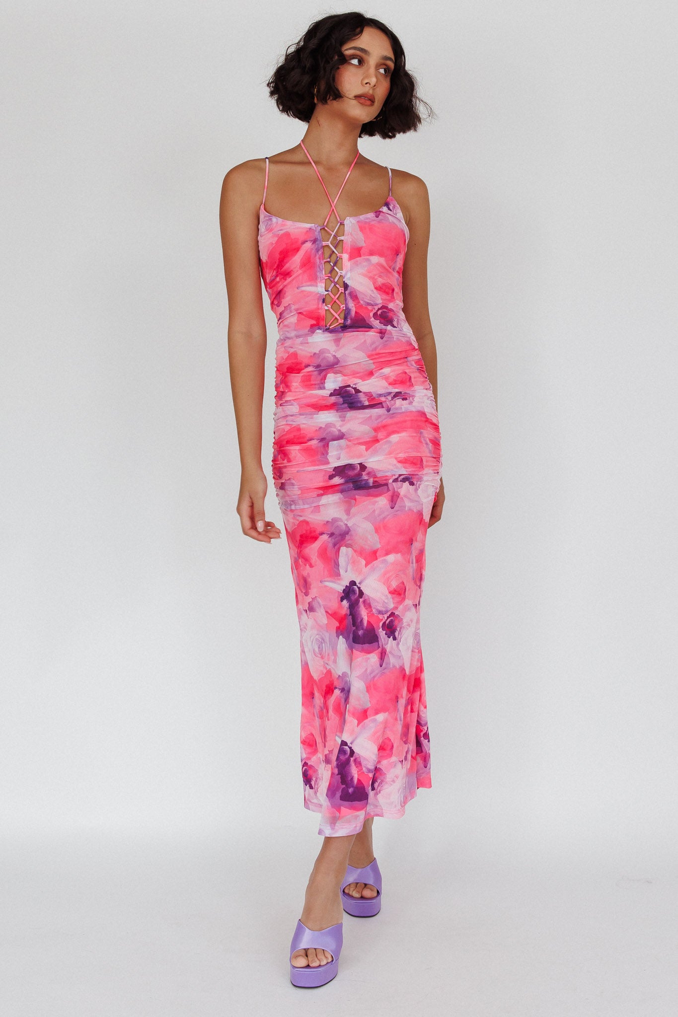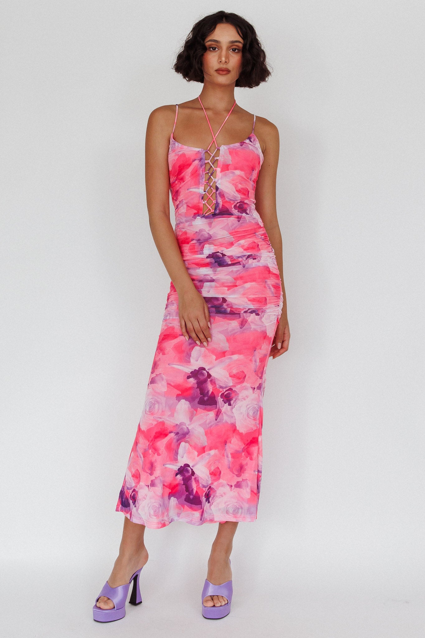 Gypsy Garden Laced Bodice Ruched Midi Dress Pink
