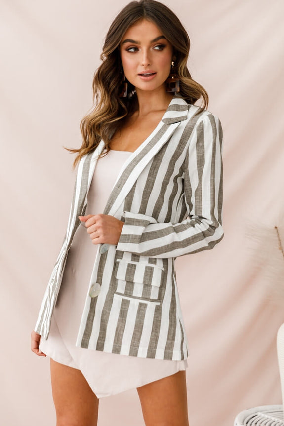 Okay girl, we see you! This jacket needs a moment because it is perfection. All class and ultra feminine-chic, we are loving the notched lapel style with double buttons and two different kinds of pockets, welt and flap style, on each side of the jacket front because you can never have too many pockets. We are obsessed with the fresh stripe pattern fabric. So versatile, you can wear it to the office over a crisp white blouse and skinny jeans, or style it over your favorite white mini dress.