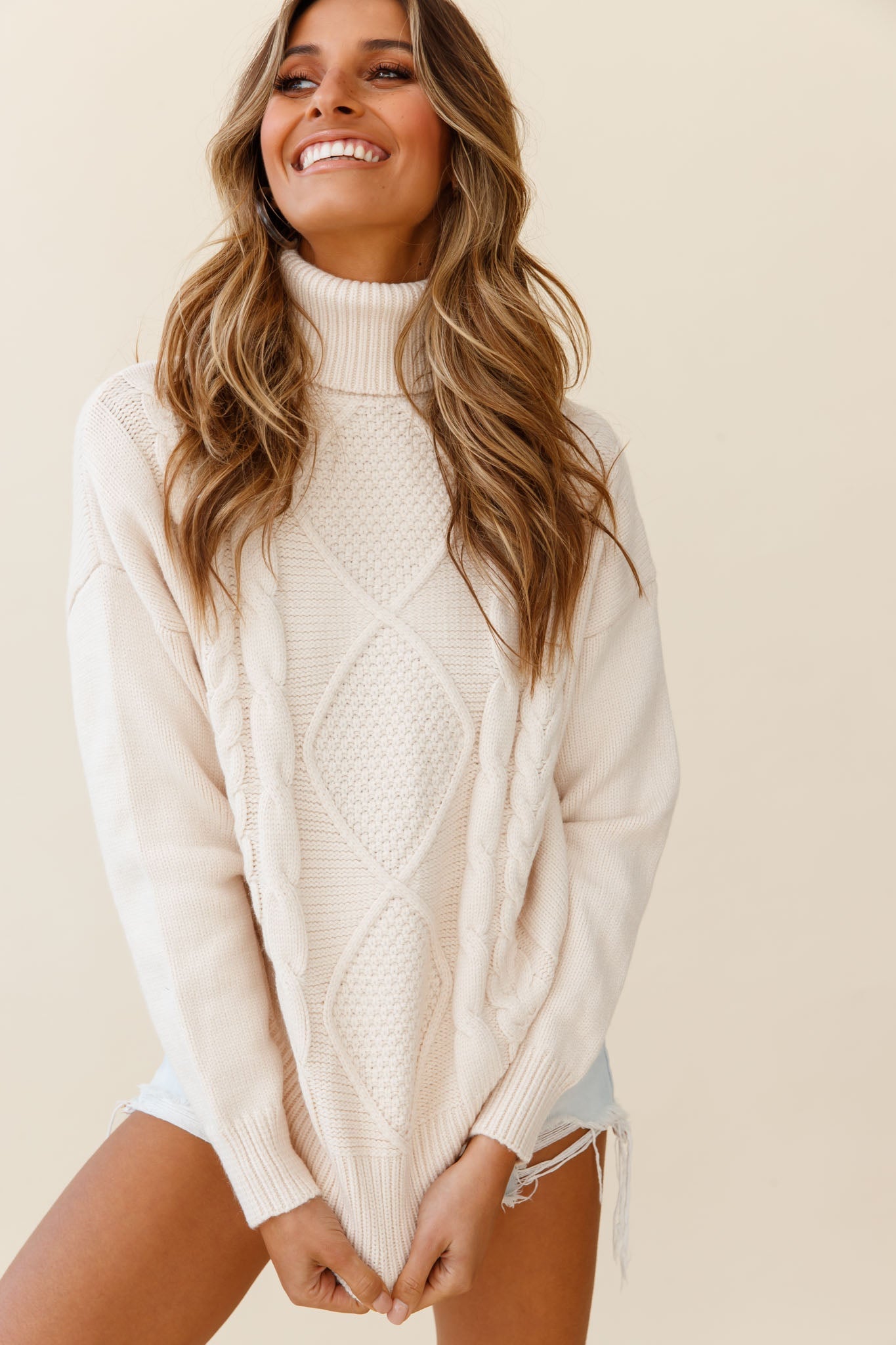 Hey there, cutie! We're in love with our chic but cozy Hark sweater. Perfect for a crisp Fall day at your fave outdoor mall. We are obsessed with its high, rolled turtleneck and cable knit detail. Team it with some cut-off shorts and ankle boots for a hot look we are loving.