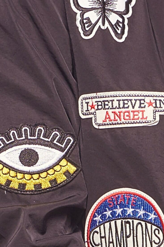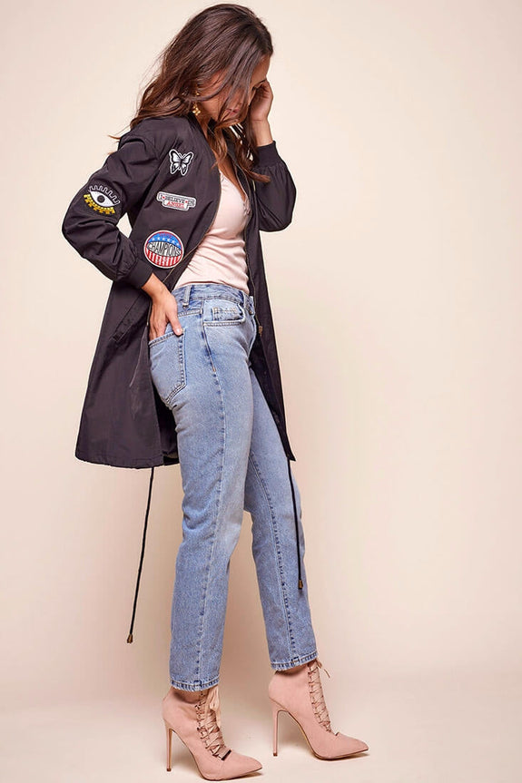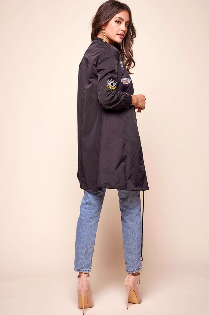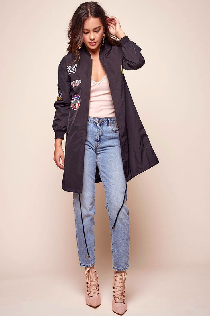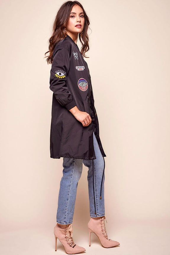 Patch up any broken heart with this long patchwork bomber jacket. Perfect for keeping the chills away! Pair with a fitted crop top and high waisted jeans for a bad gal approach to life.