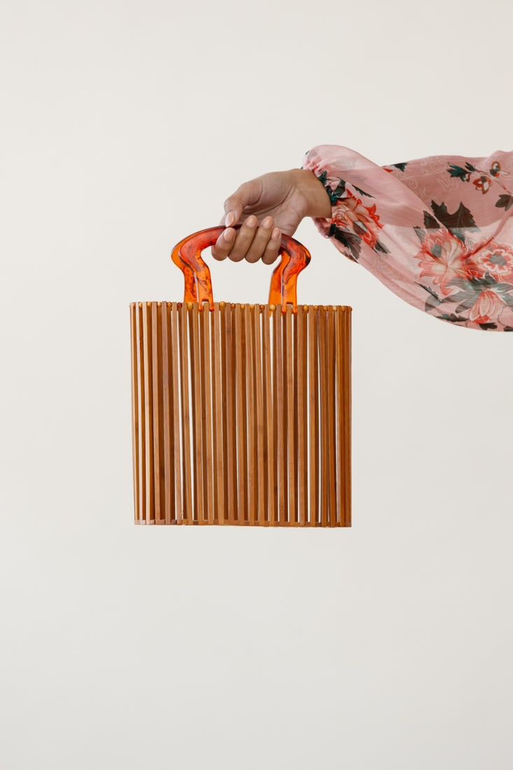 Channel your inner 70's boho babe with our gorgeous Harmony tote. We are obsessed with its unique materials, the wooden slat body and pretty, marbled amber, molded acrylic handle. Perfect with your fave maxi dress and sandals.