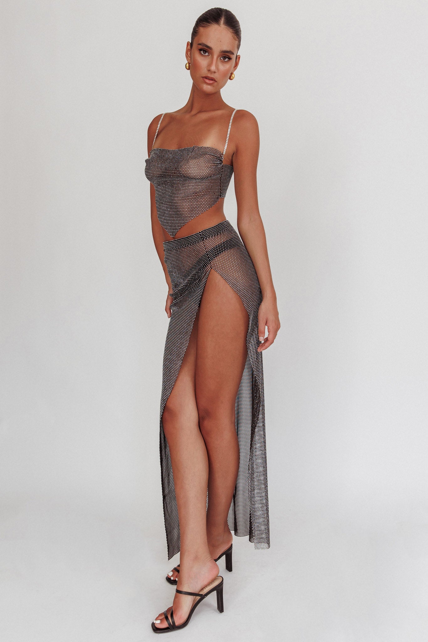 You will stop the show in our stunning Heart Breaker maxi skirt. It features a super high thigh split and diamante mesh and is perfect for a glam event or music festival teamed with a crop top and mules for a jaw-dropping look.