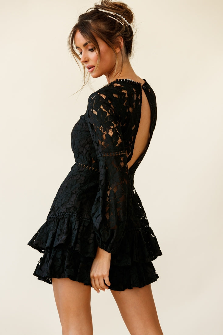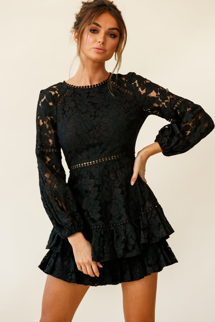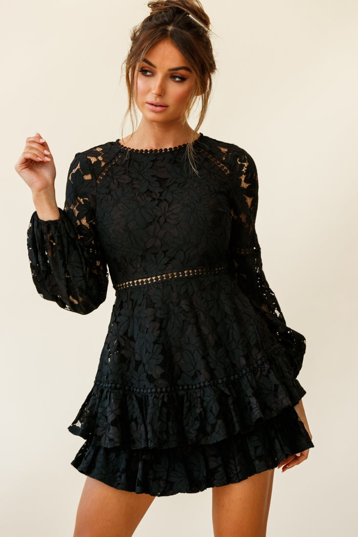 Make an entrance in our elegant Henrietta dress. Partially lined, it features a gorgeous lace overlay, long sleeves, crochet inserts and layered ruffle hem. perfect for a bridal shower or special occasion teamed with nude heels and a clutch.