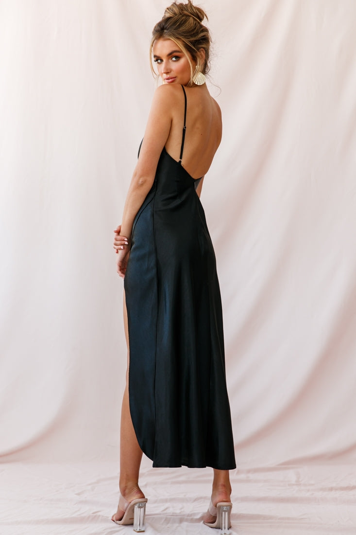 Hey Girl HEYYY, you are breaking hearts tonight in this hot AF long satin dress. Our Hey Girl dress flaunts a sexy, low back with adjustable straps, a flattering cowl neck and hot asymmetrical, thigh-high split hemline. We are obsessed with the silky fabric and wrap look skirt that pleats at the waist. Tbh it doesn't matter what you pair this with cause the dress will be getting all the attention. If you want some advice though? Keep the heels sexy and simple, single strap stilettos in nude or black, add a few pieces of delicate jewelry and watch jaws drop.