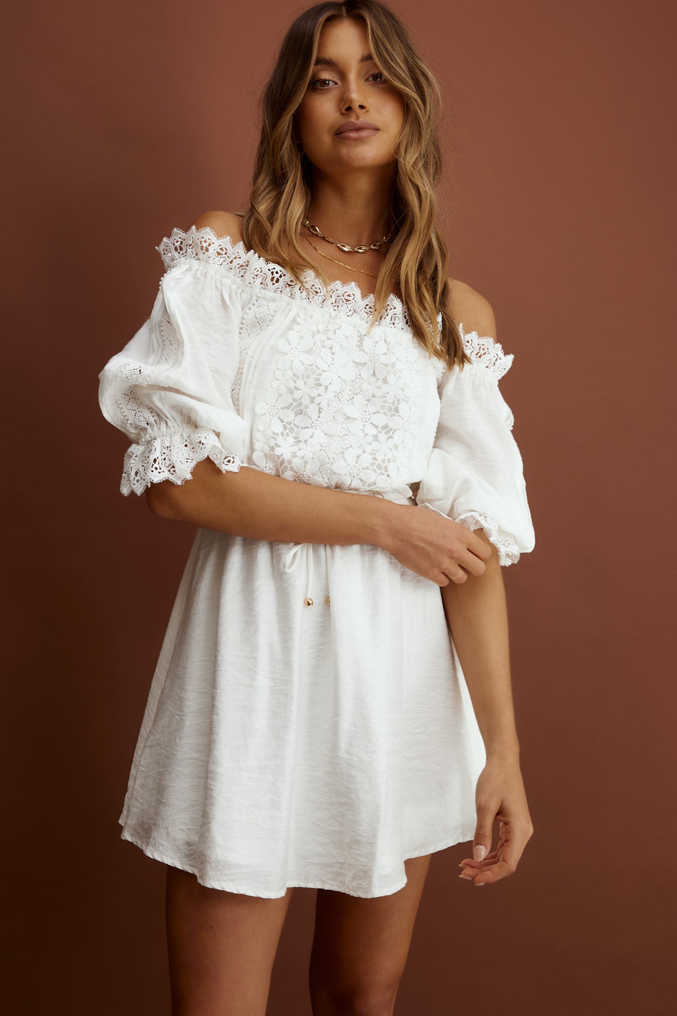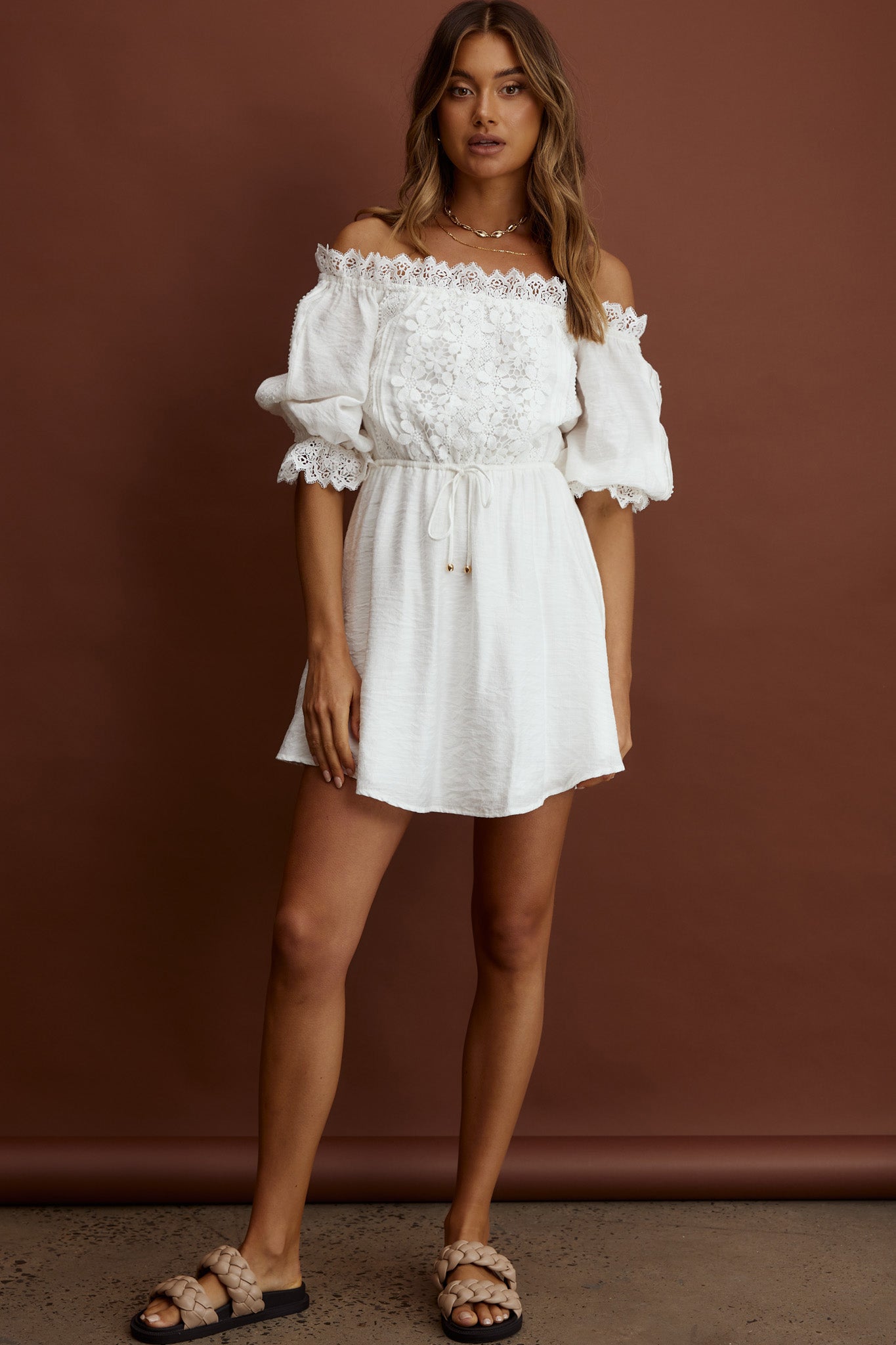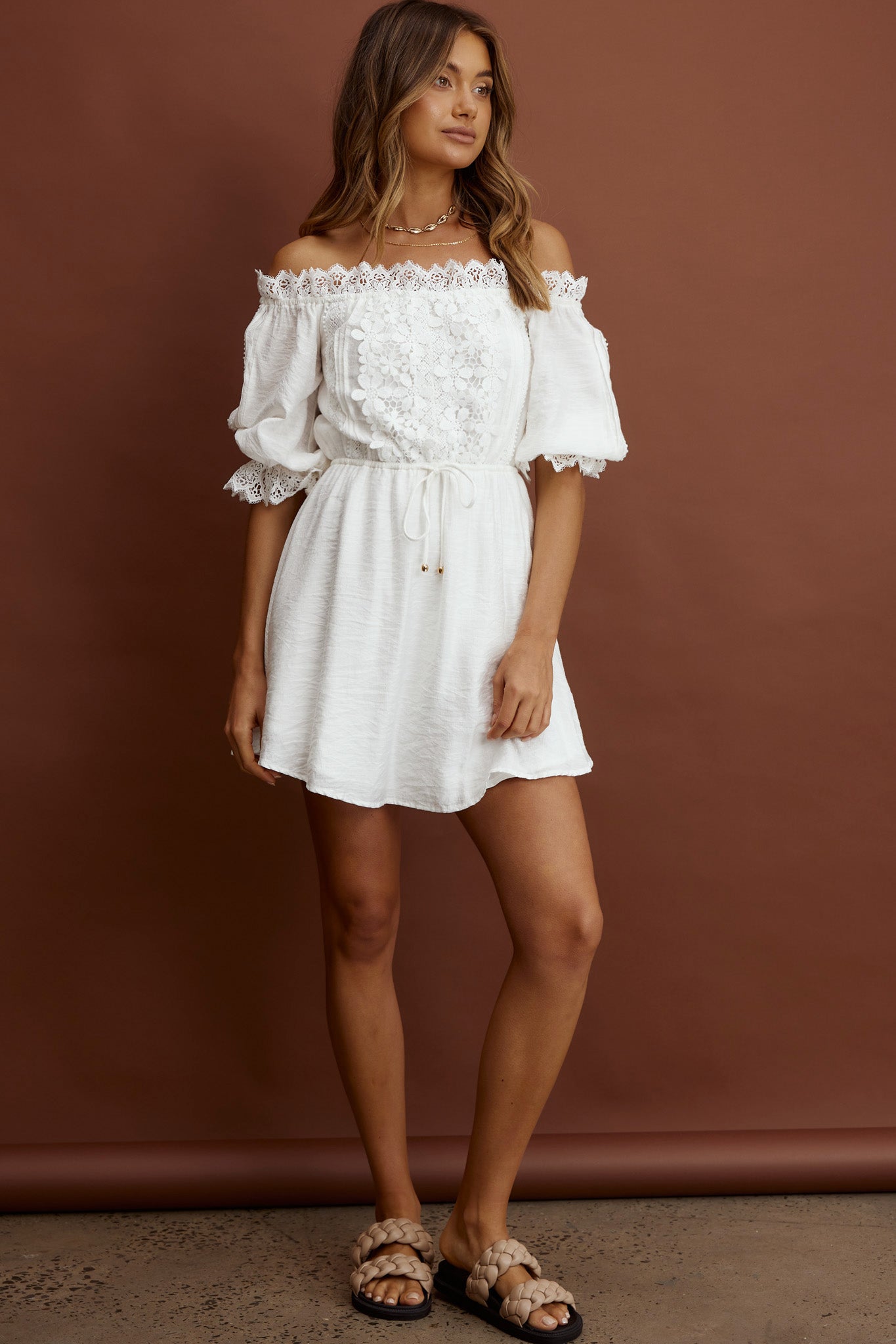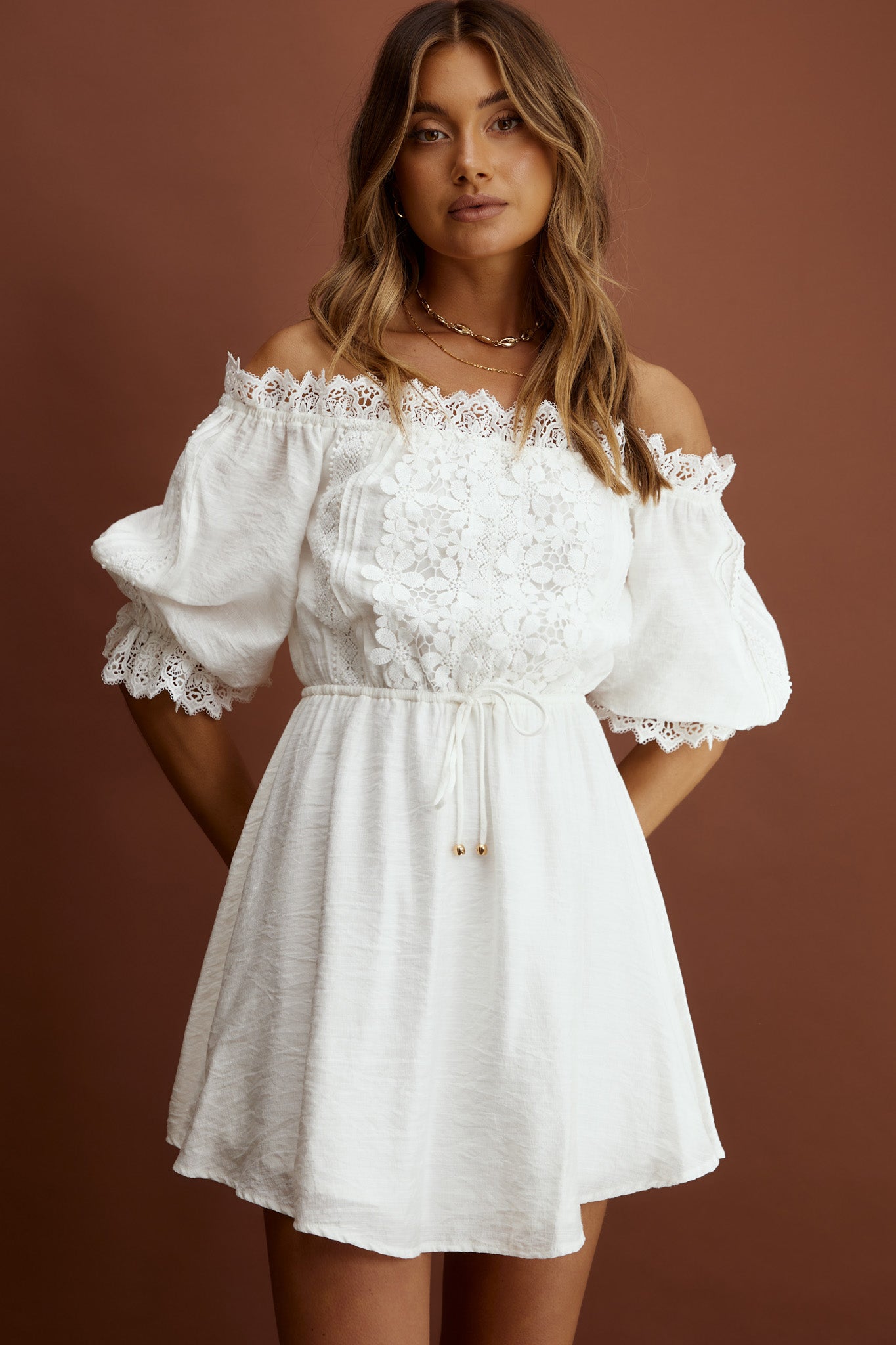 Girl next door meets boho chic in our super cute Homeward dress. We are loving the crochet lace detail and on-trend, off-shoulder style. Perfect for meeting up with your girls for coffee and laughs. Team it with your fave tote and mules for a look we are loving.