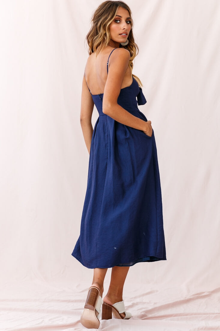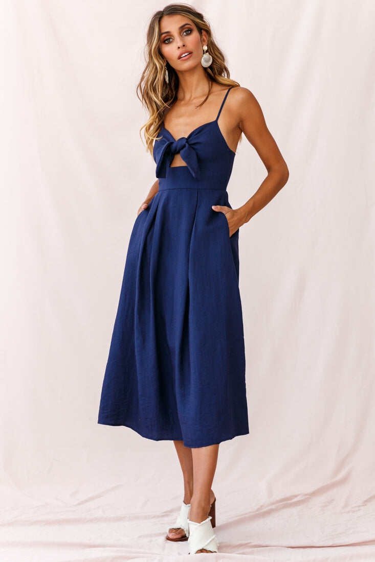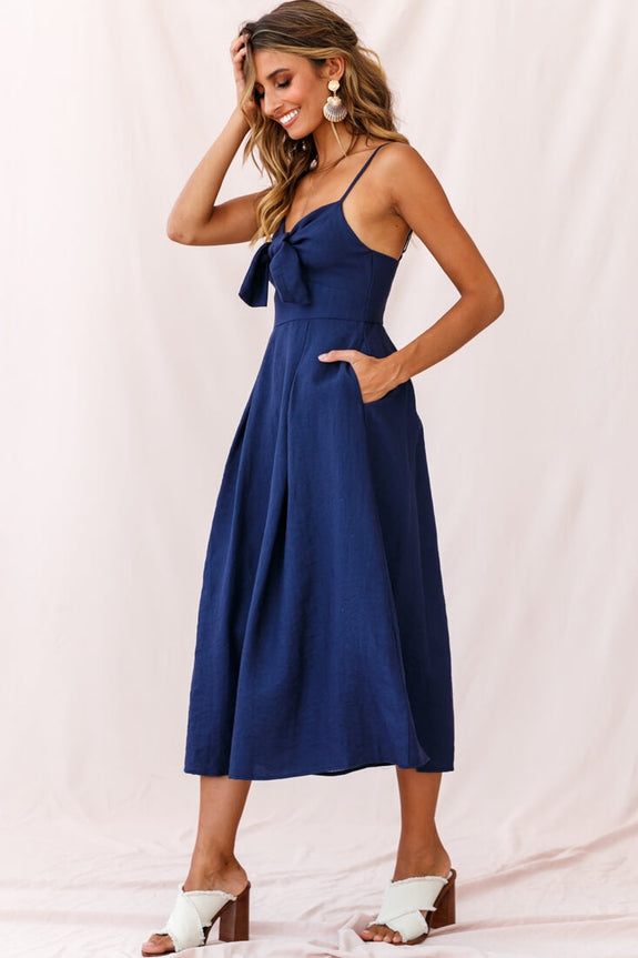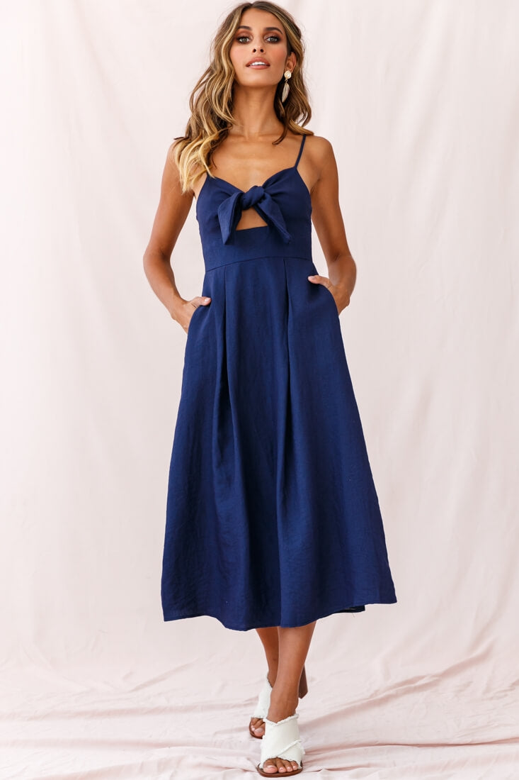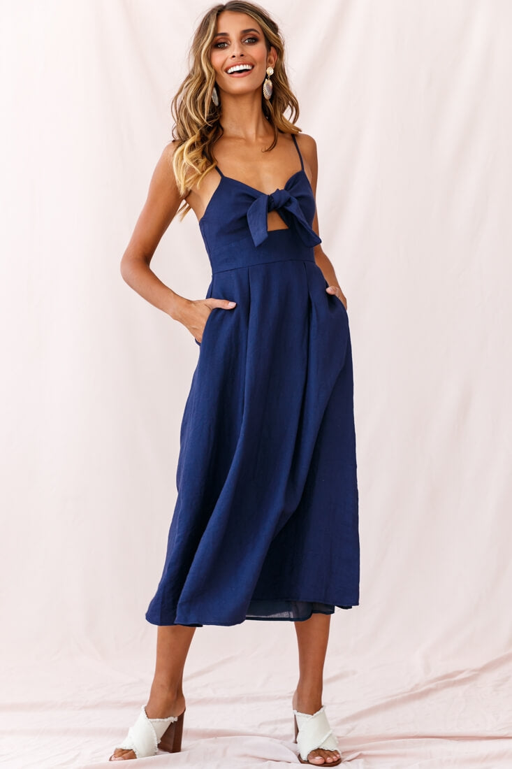 Okay cutie, you are stealing the show in our darling Hope midi dress. Featuring adjustable shoulder straps, invisible zipper and an adorable tied knot feature over the bust. Oh and did we mention, it has pockets! Perfect for a picnic with bae or strolling the farmer's markets on a warm, sunny day styled with sandals and a straw tote.