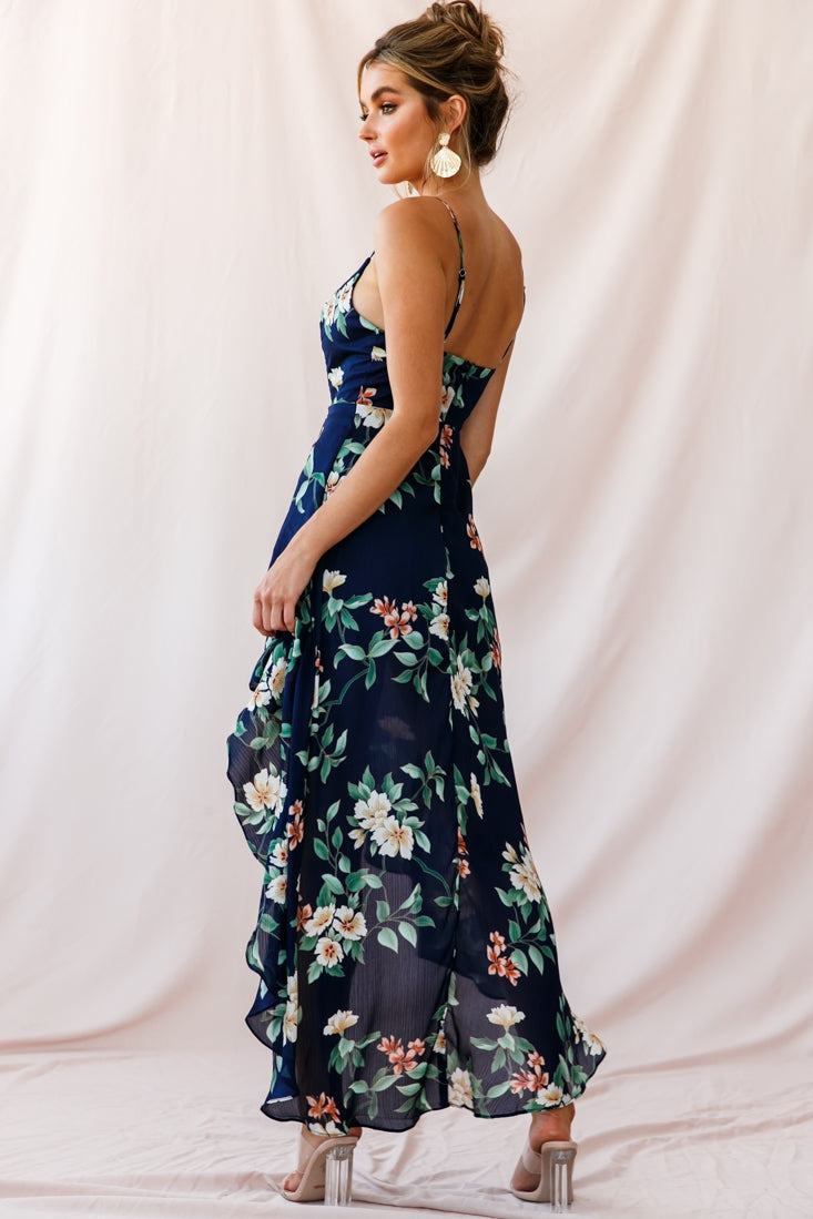 Look like a princess in our stunning Imelda dress! Perfect for cocktails with your girls at a classy rooftop bar or an extravagant daytime event. Featuring a plunging V-neckline, high-low hem, adjustable cami straps and the most gorgeous, soft, floral print fabric. Team it with gold hoop earrings, tousled locks and a clutch for an elegant look we are loving.