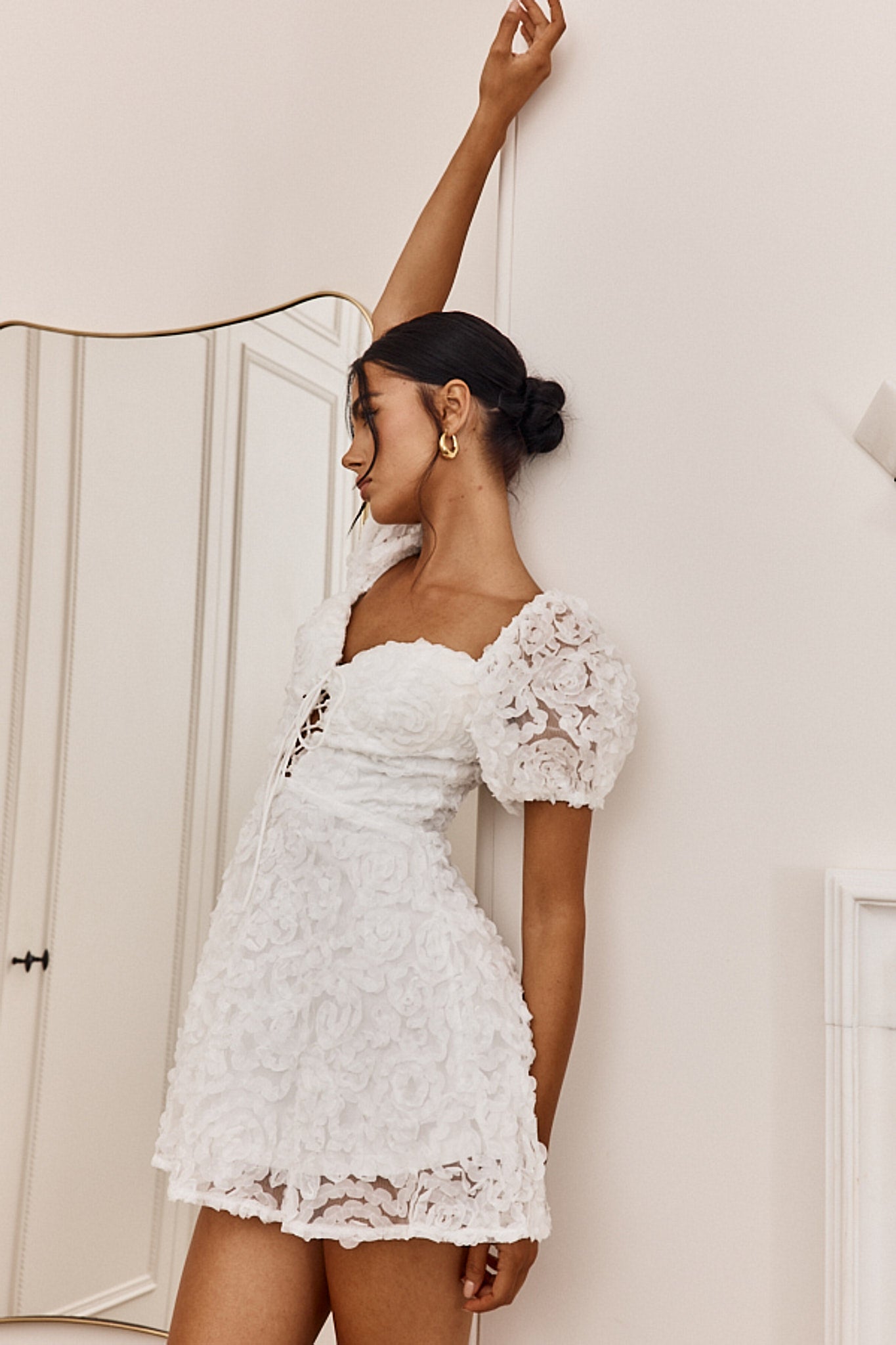 All eyes will be on you in our adorable Imogen mini dress. Featuring a floral embellishment throughout and a lace-up bodice. It's perfect for a bachelorette or birthday party. Team it with white, strappy heels and a satin clutch for a look that will turn heads.