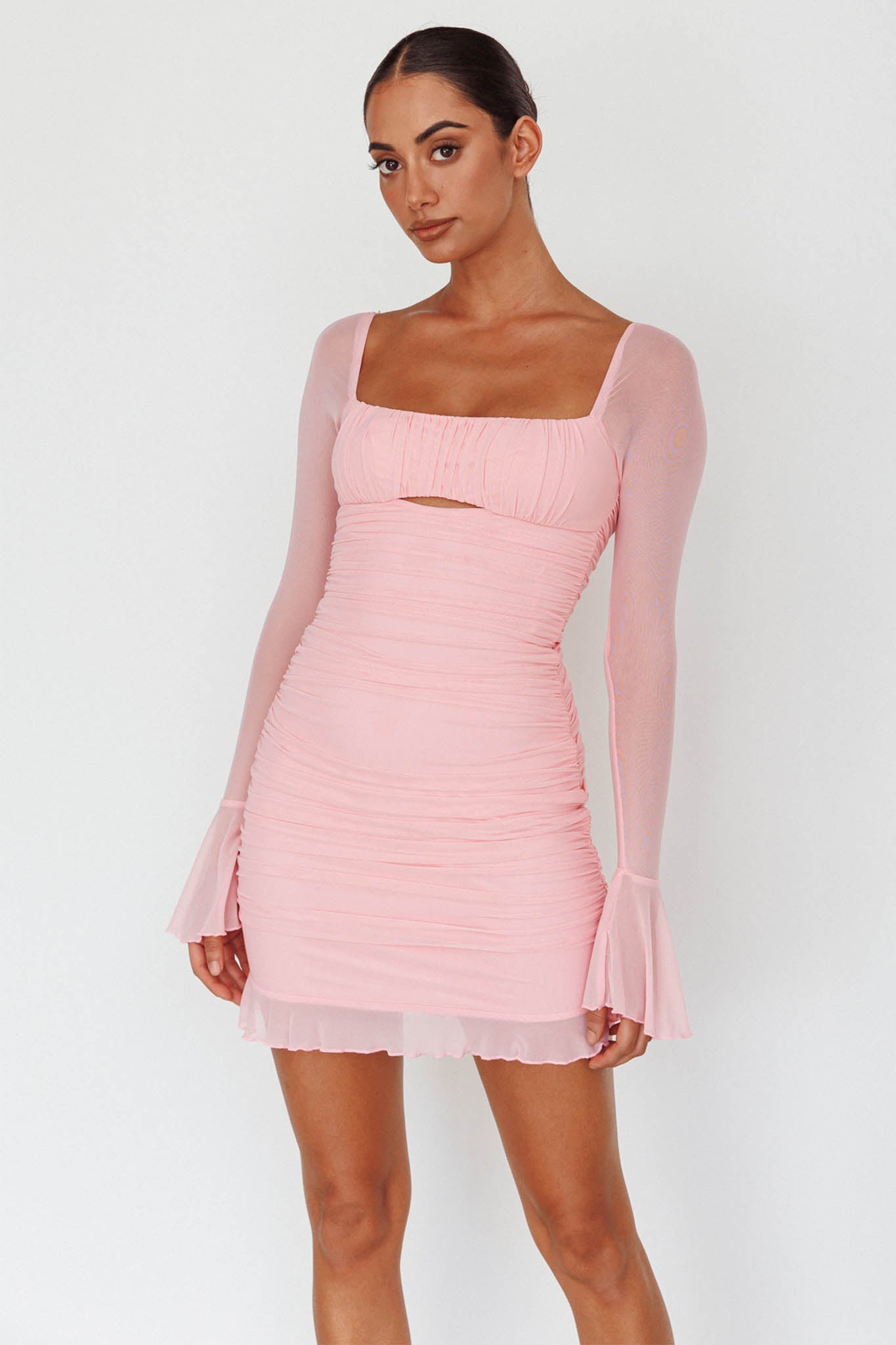 Say hello to our gorgeous In Bloom mini dress. Featuring gathering in the body and a long, sheer sleeve with flared cuffs. Perfect for a wedding or special event. Team it with kitten heels and a tote for a look we are loving.