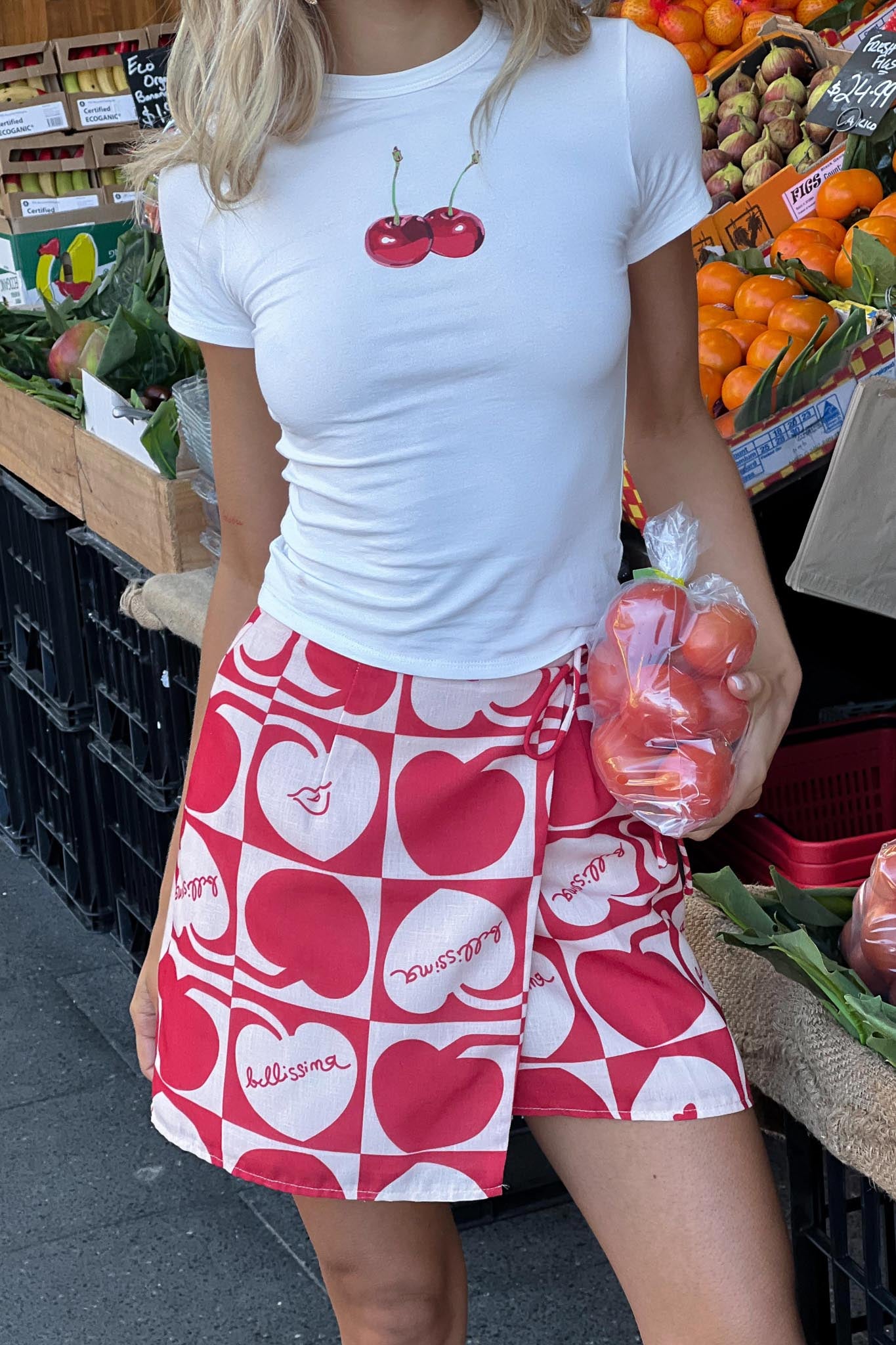 Embody the essence of summer with our Ithaca mini wrap skirt! Featuring a playful side tie and cherry print, this skirt is sure to add a touch of paradise to your fits. Pair it with our matching top for an effortlessly coordinated look or mix and match for endless combination.