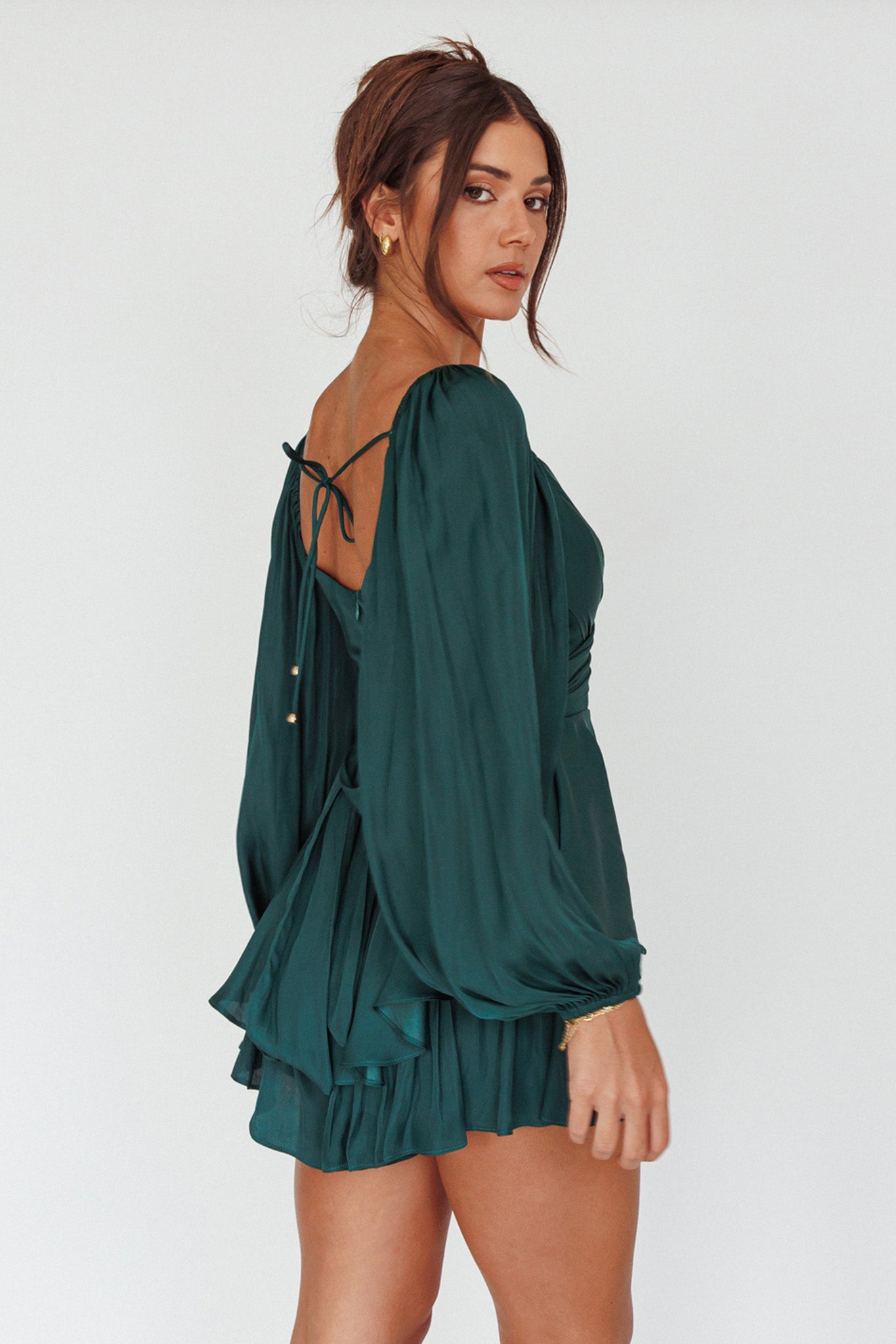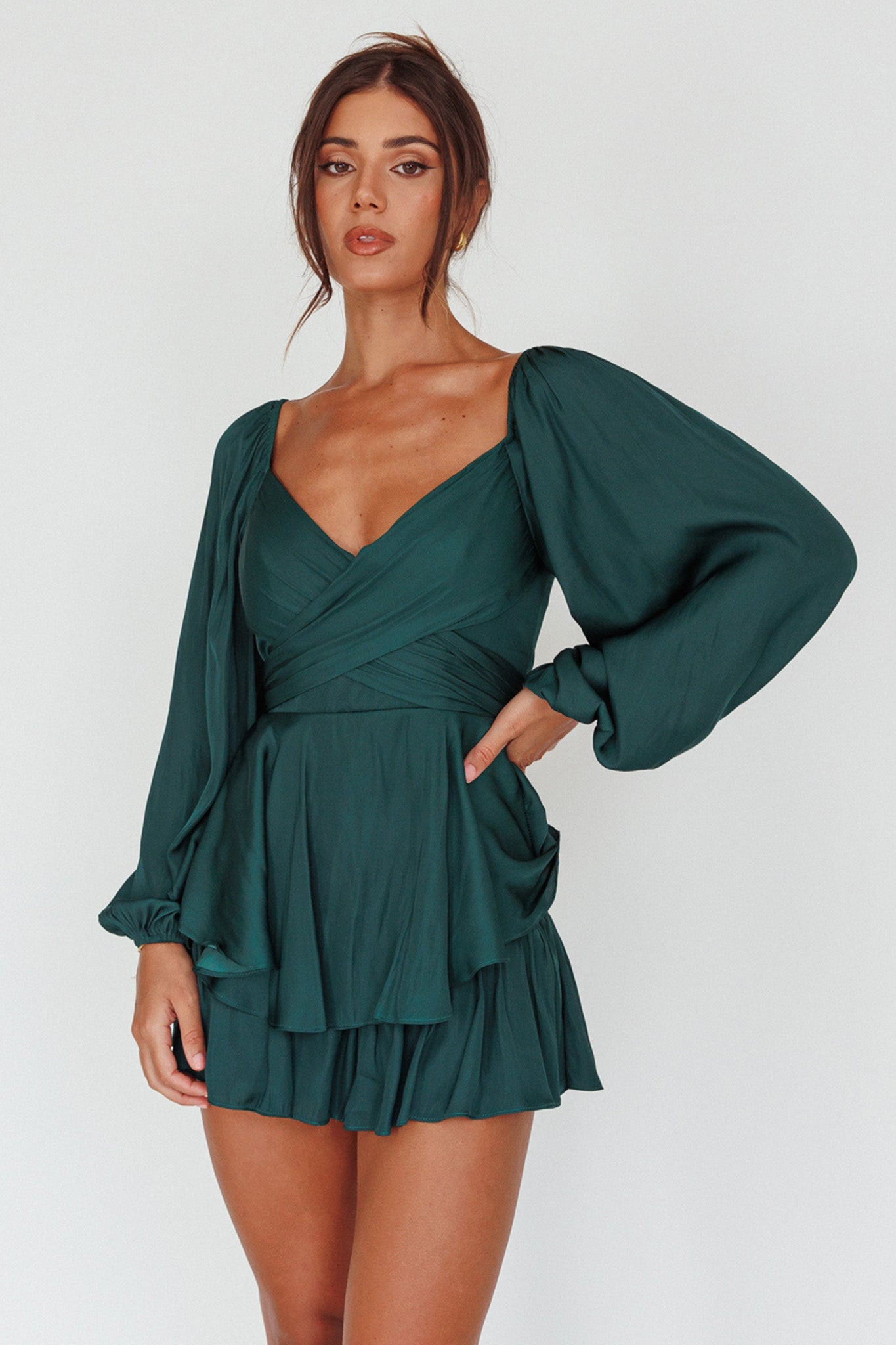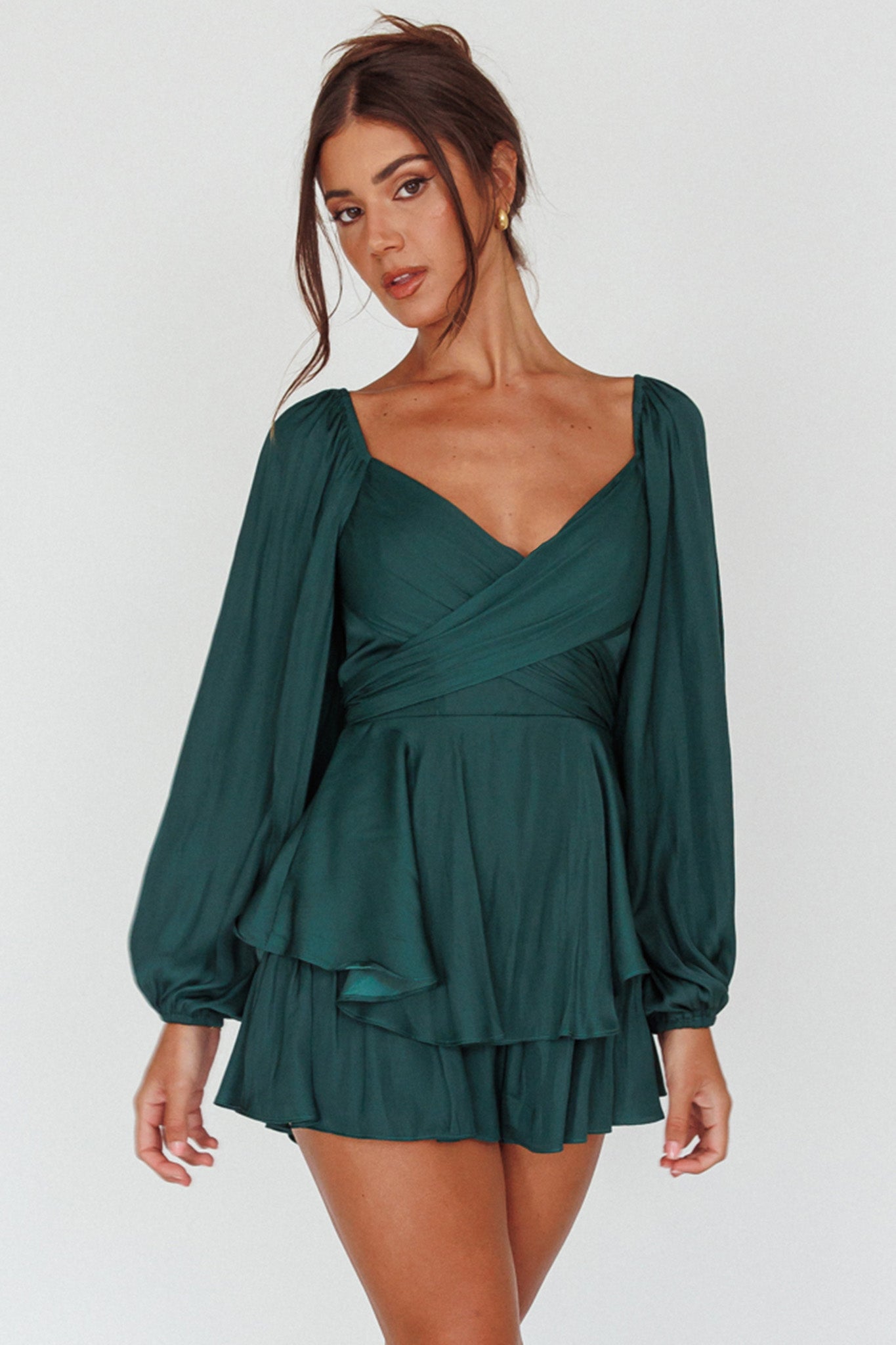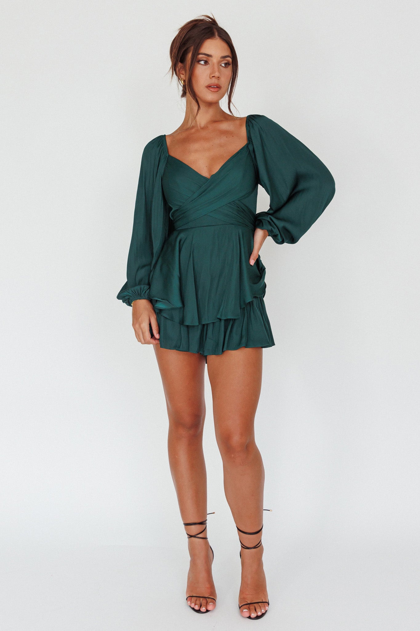 It's Complicated Long Sleeve Flounce Romper Forest Green