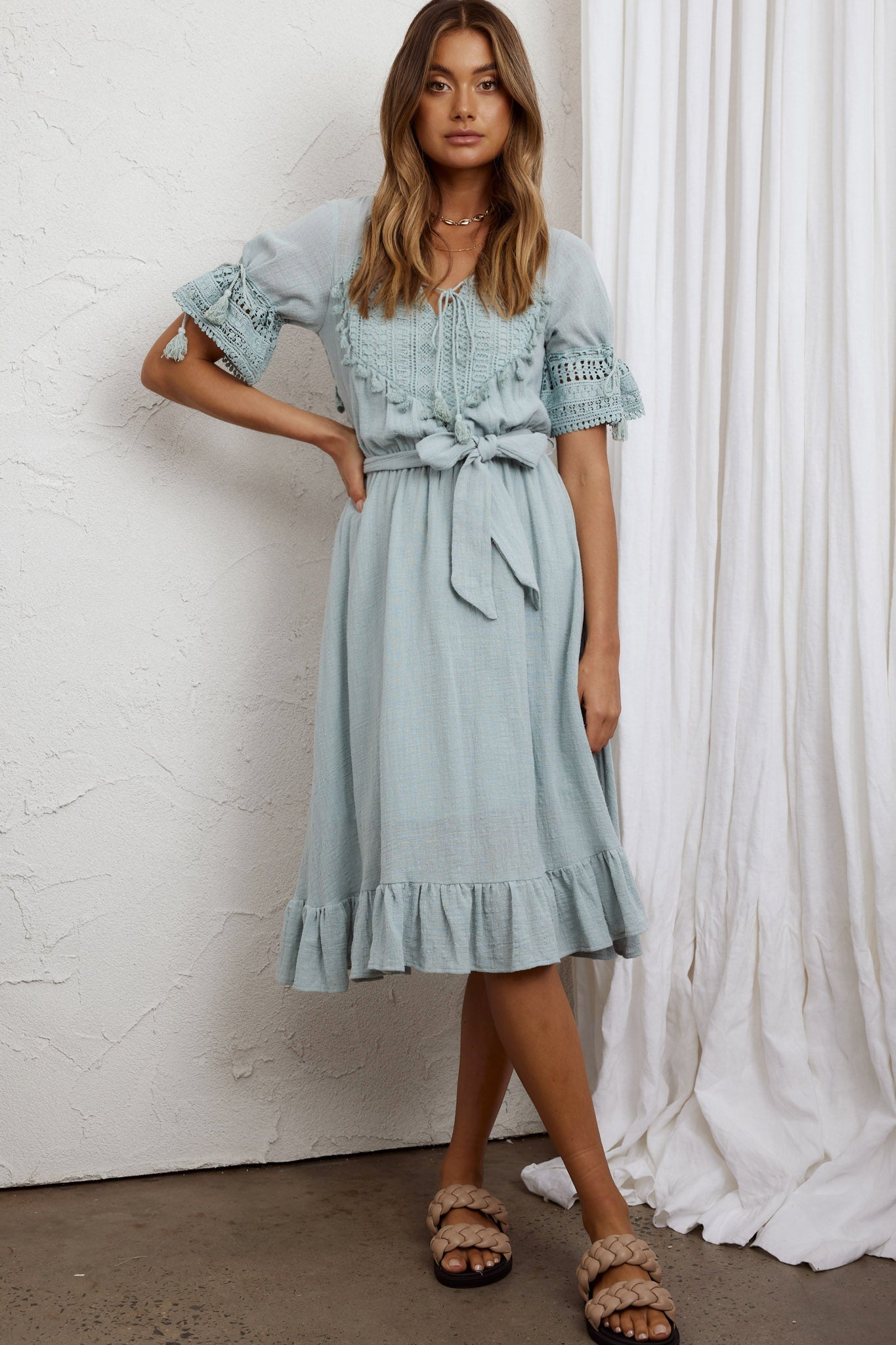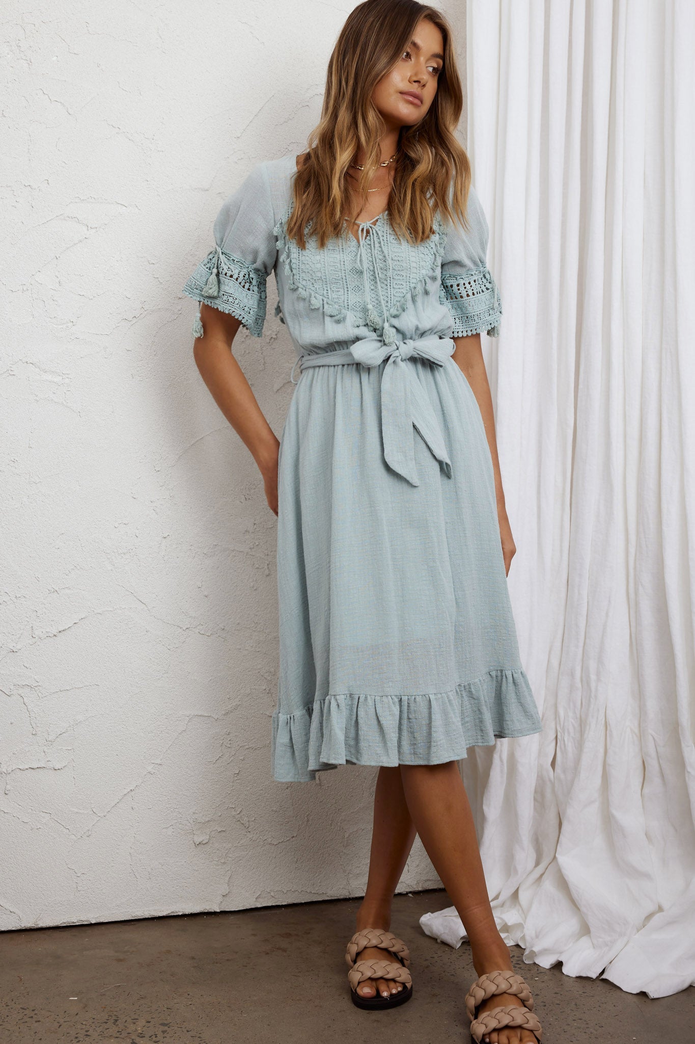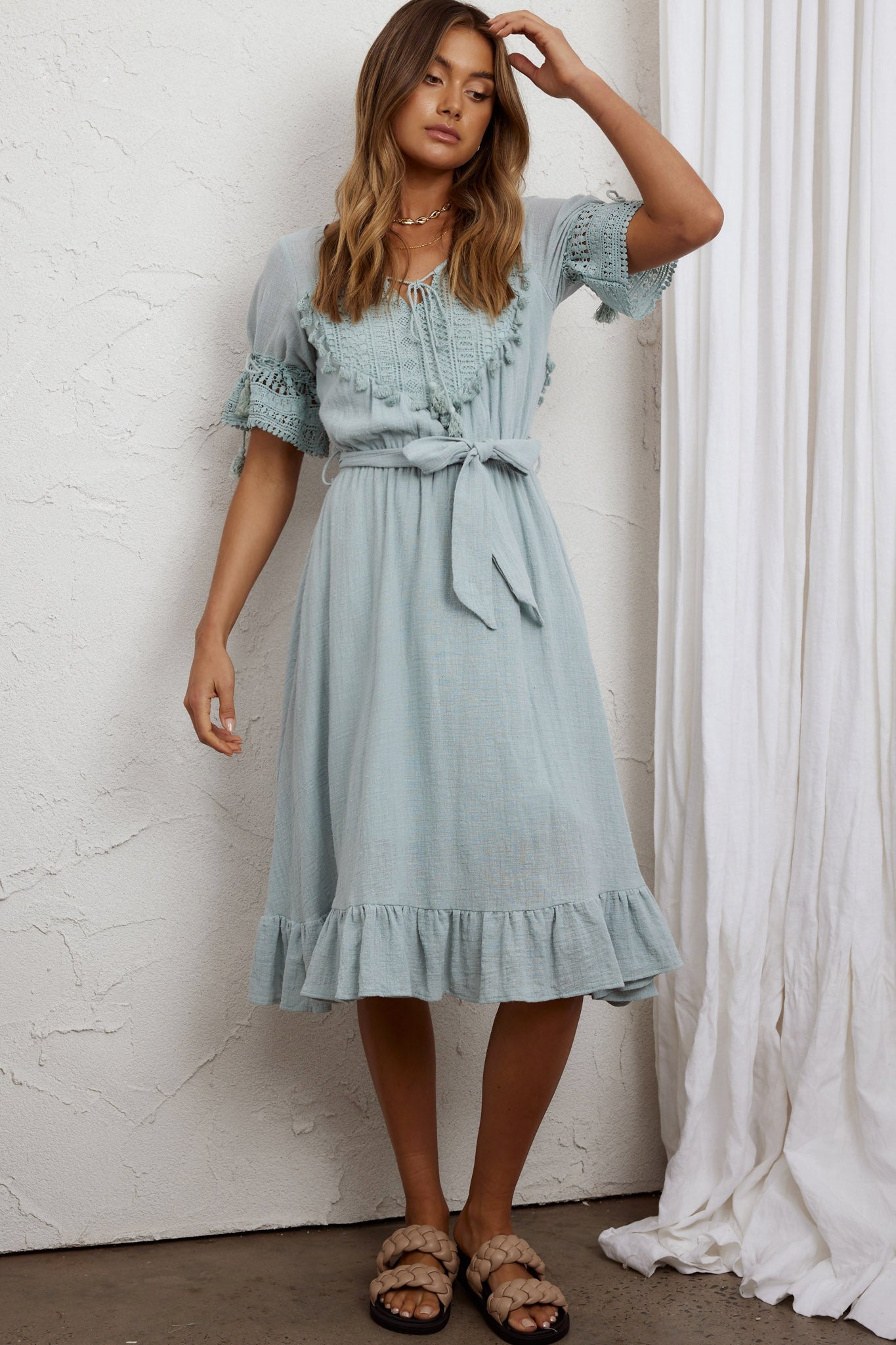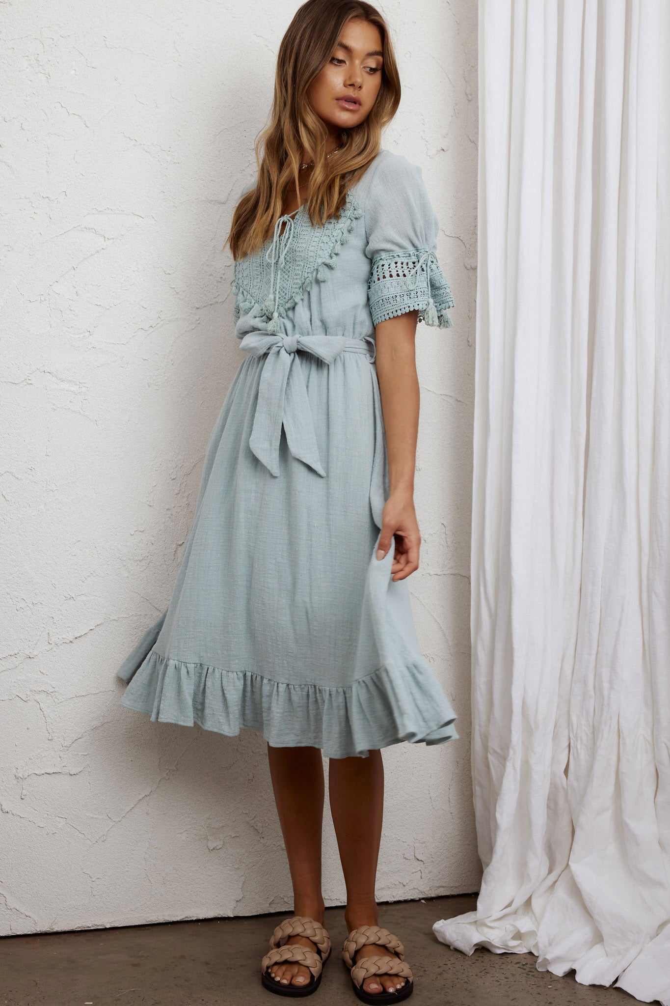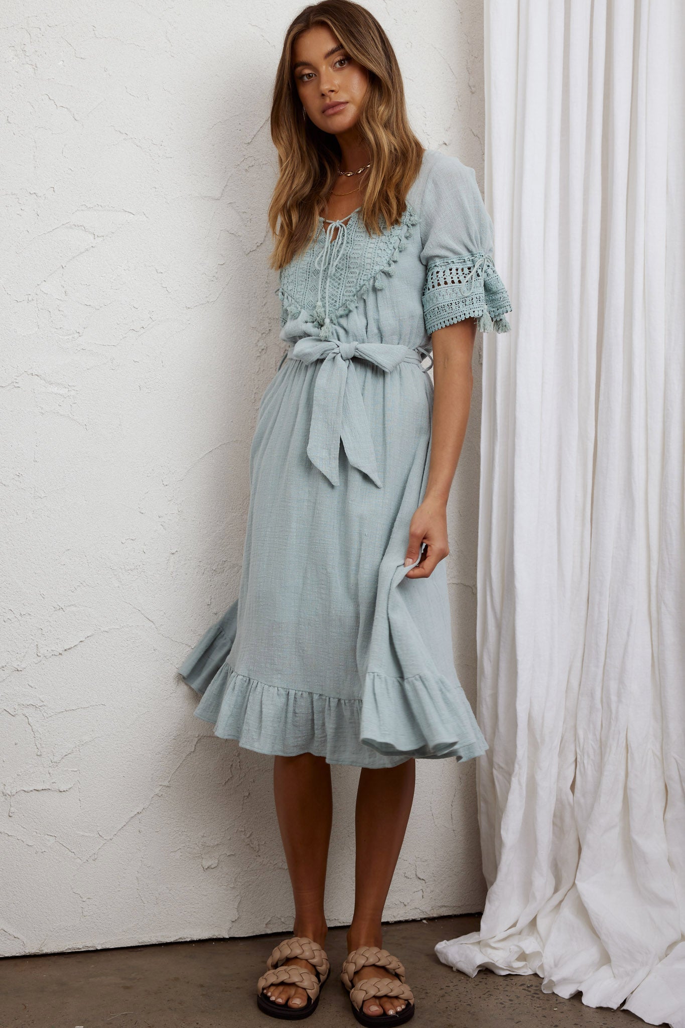 Perfect for sunny days at a park picnic with your besties, our Jada dress is a must-have. Featuring a short sleeve, drawstring tie neckline and crochet and tassel embellishment. This dress looks great styled with some canvas wedges and a fedora or crisp white sneakers for a playful look.